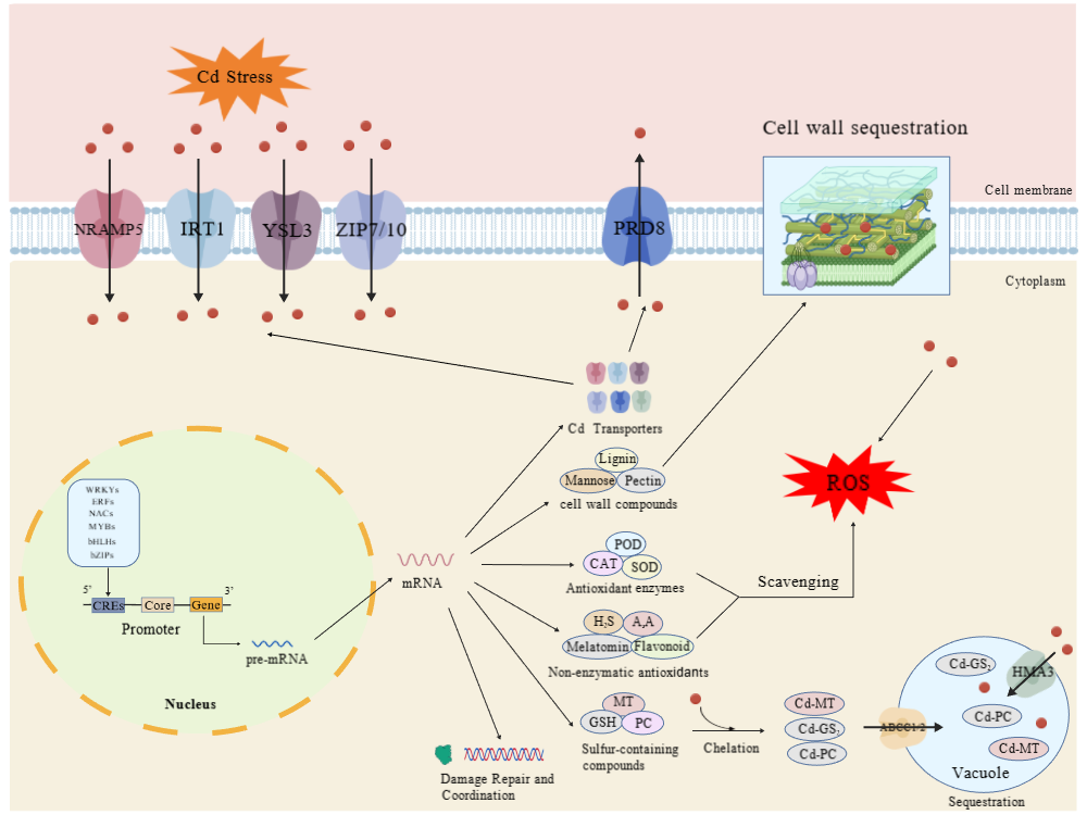 | WRKY | Rape | Cd | BnWRKY11, BnWRKY28, BnWRKY33, BnWRKY75 | Upregulates genes encoding GST and PCS, promoting formation of low molecular weight complexes (PC-Cd) | / | Induced | / | / | / | [51] |