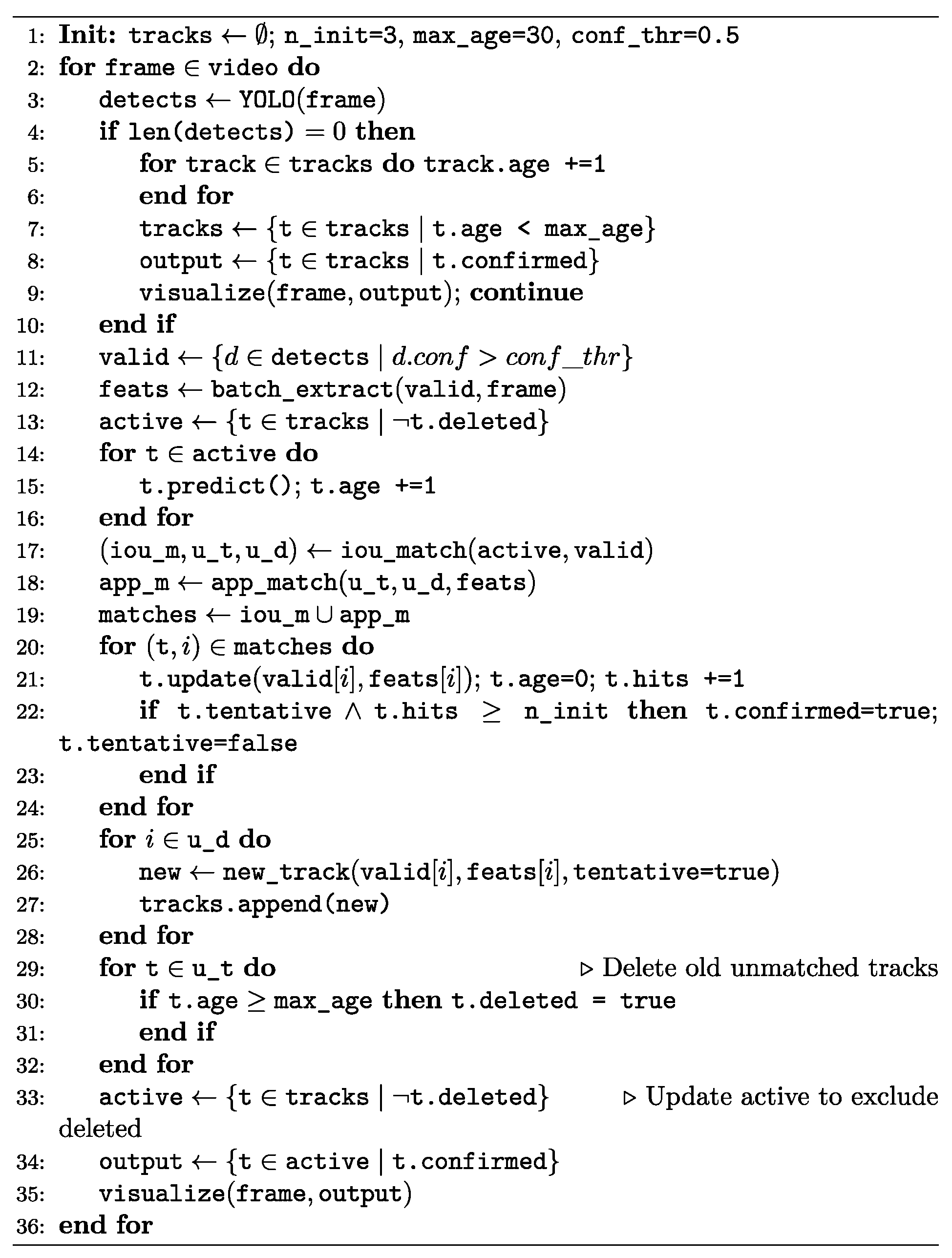 - Wojke, N.; Bewley, A.; Paulus, D. Simple Online and Realtime Tracking with a Deep Association Metric. In Proceedings of the 2017 IEEE International Conference on Image Processing (ICIP), Beijing, China, 17–20 September 2017; IEEE Press: Beijing, China, 2017; pp. 3645–3649. [Google Scholar]