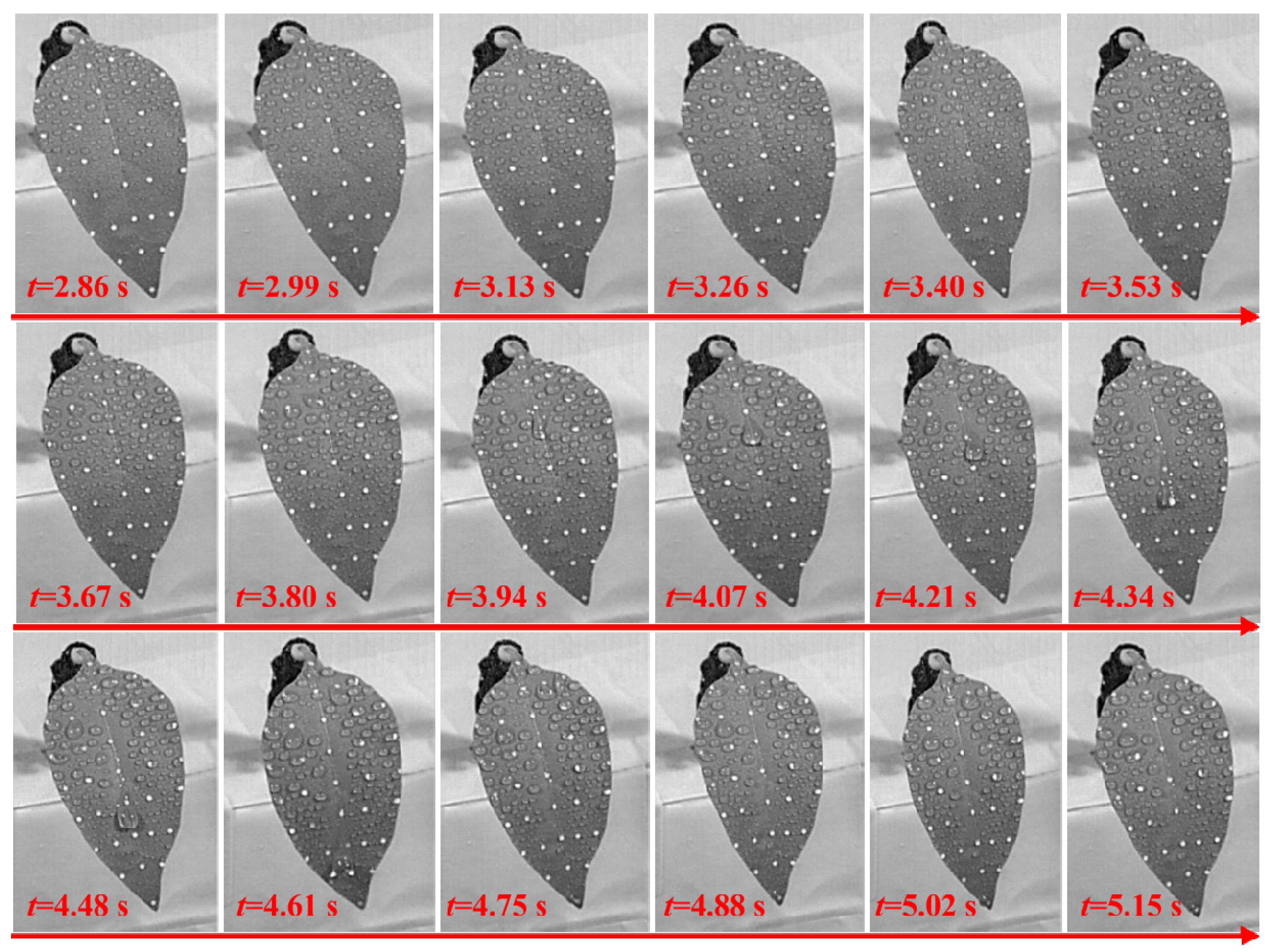 - Gilet, T.; Tadrist, L. Leaf Oscillation and Upward Ejection of Droplets in Response to Drop Impact. Phys. Rev. Fluids 2025, 10, 053601. [Google Scholar] [CrossRef]