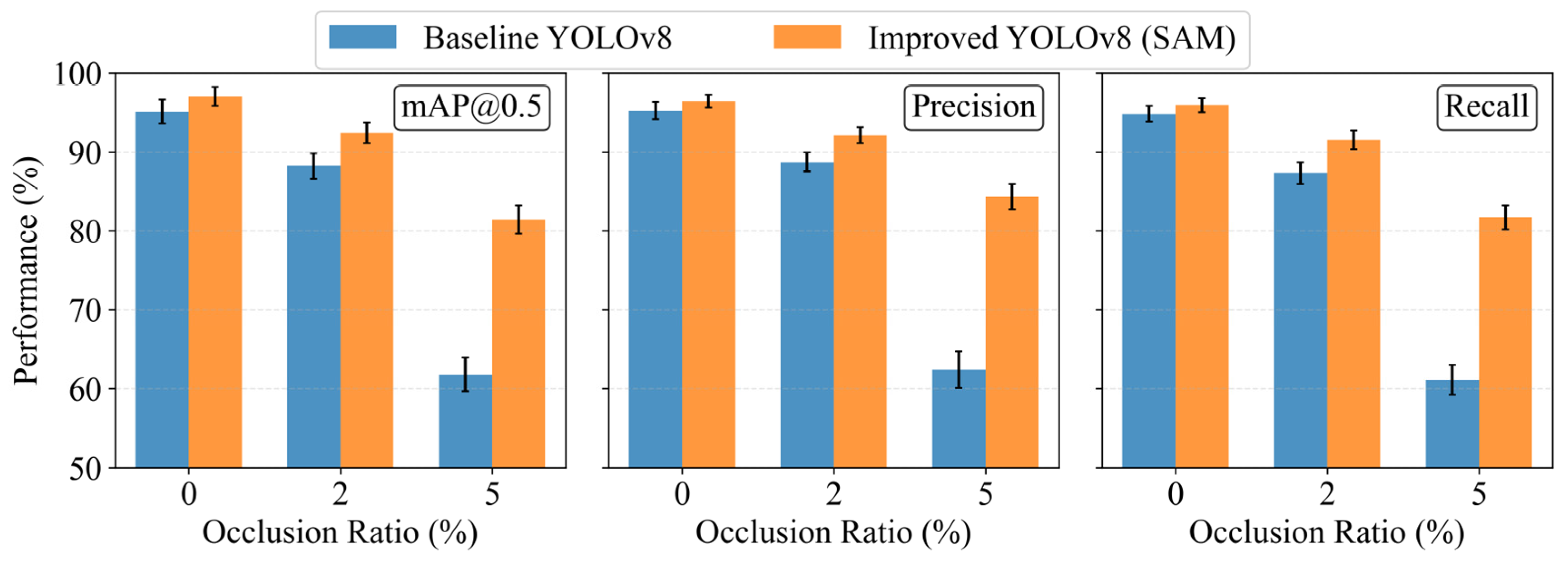 | Occlusion Ratio | Model | mAP@0.5 (%) | Precision (%) | Recall (%) |