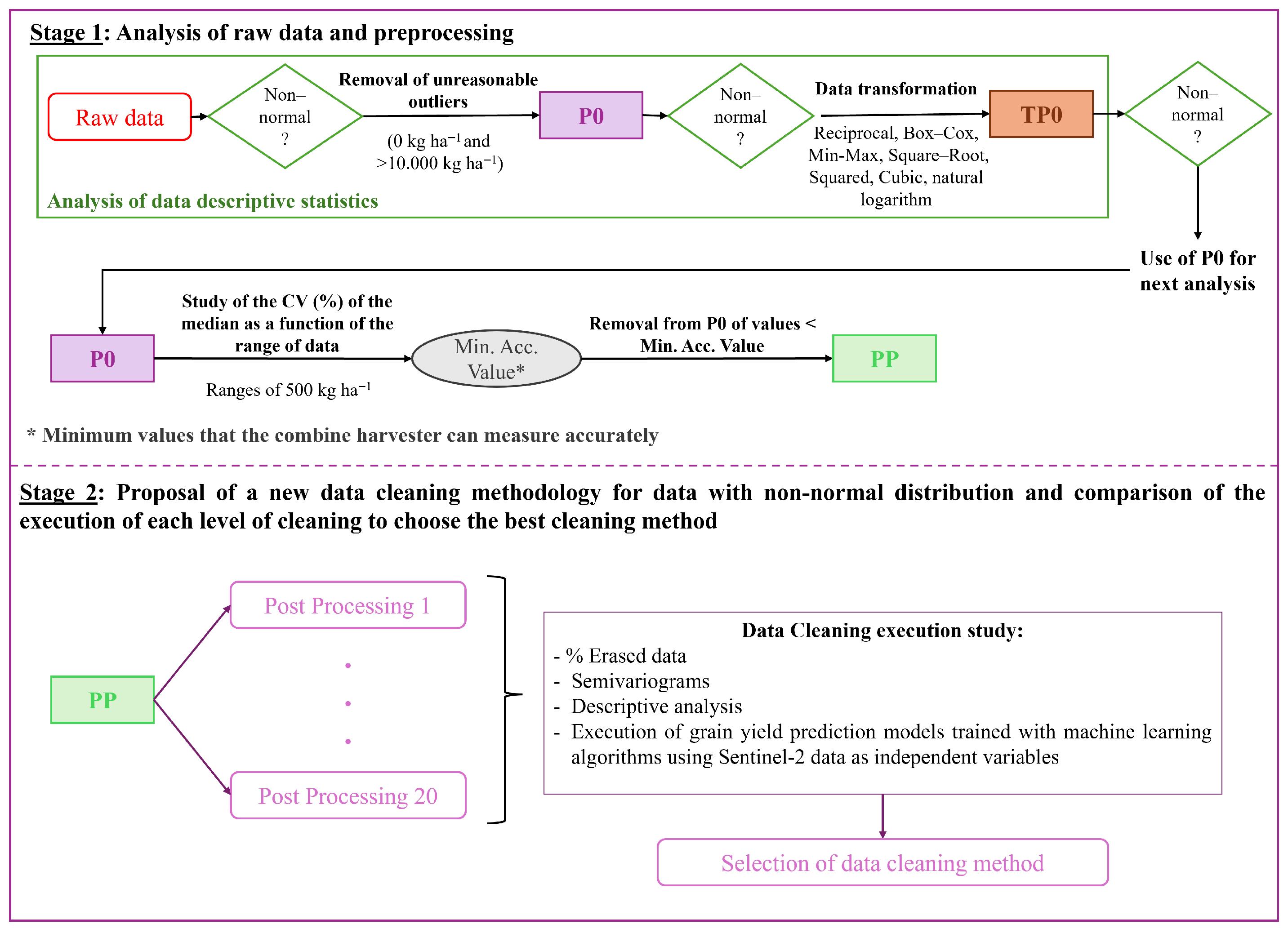 For this purpose, in this paper, the non-normality of raw yield datasets is tested and validated for a large dataset, including two different crops (wheat and barley), five locations, and four different growing seasons. Once this statement is verified, the paper aims to select a new data-cleaning protocol that can be easily automated with low computational expense. This study proposes global and local filtering, using the median and interquartile range as robust statistics to clean skewed data, along with different combinations of coefficient limits. The selection of the optimized data cleaning method is based on an analysis of the data’s internal structure and on enhancing the performance of the machine learning model trained on Sentinel-2 reflectance data and filtered yield data. The proposed method is applied in 7399 ha of wheat and barley.