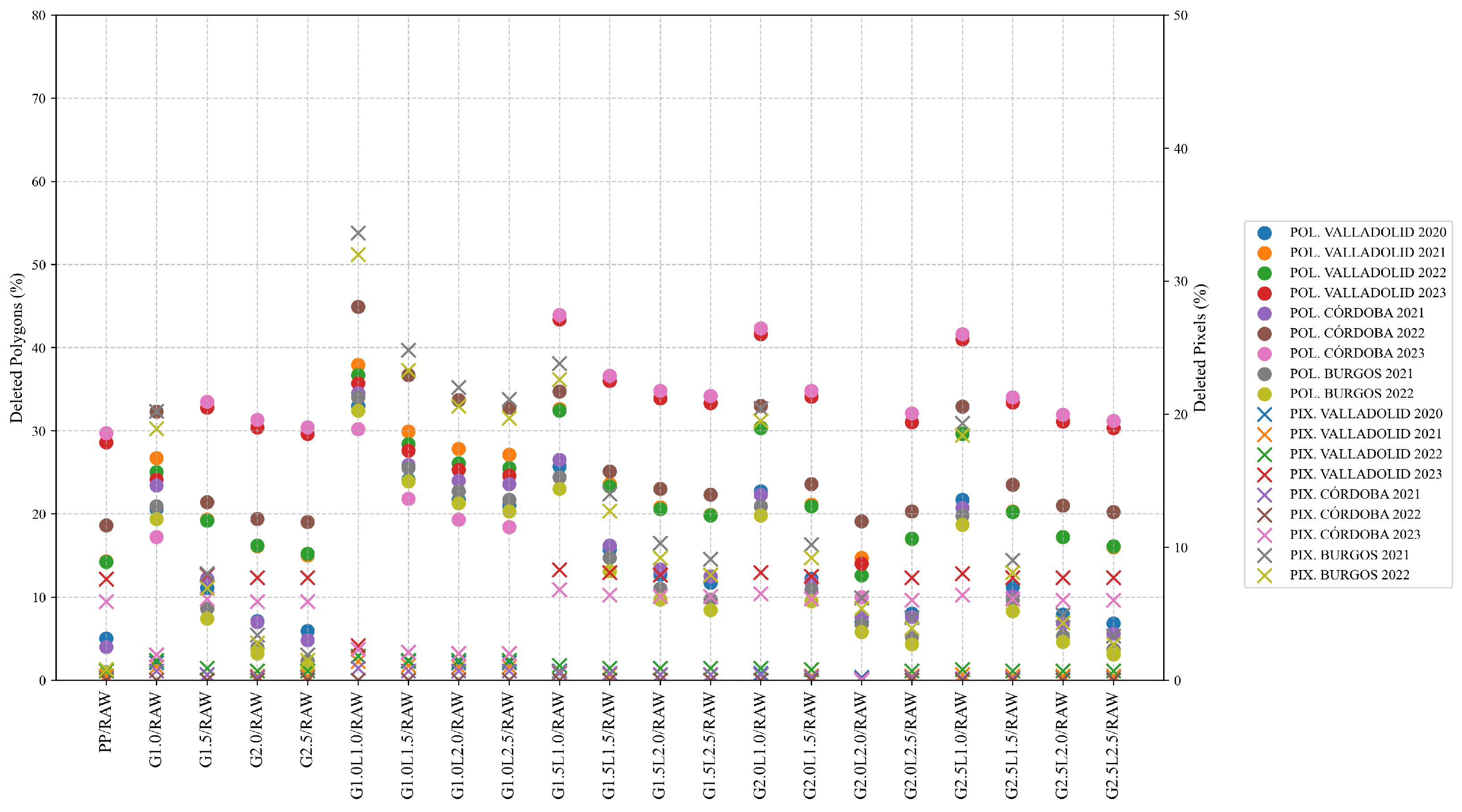 In terms of total erased data at polygon level, the results obtained are aligned with those obtained by other authors, deleting a percentage of data between 10% and 50% [
