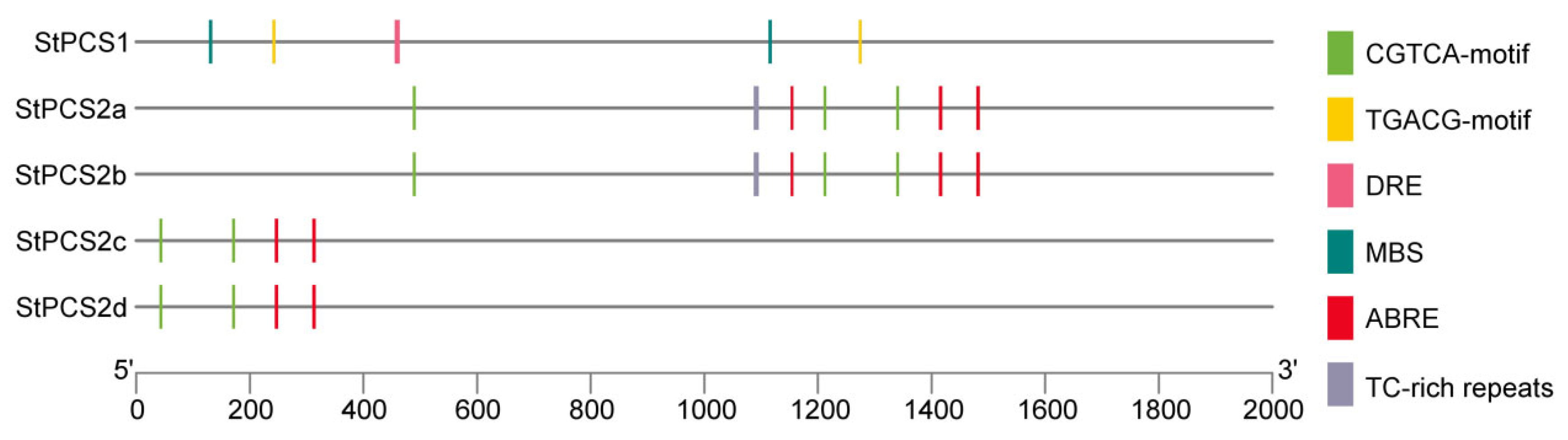 3.5. Cis-Regulatory Element Analysis of StPCS Promoters