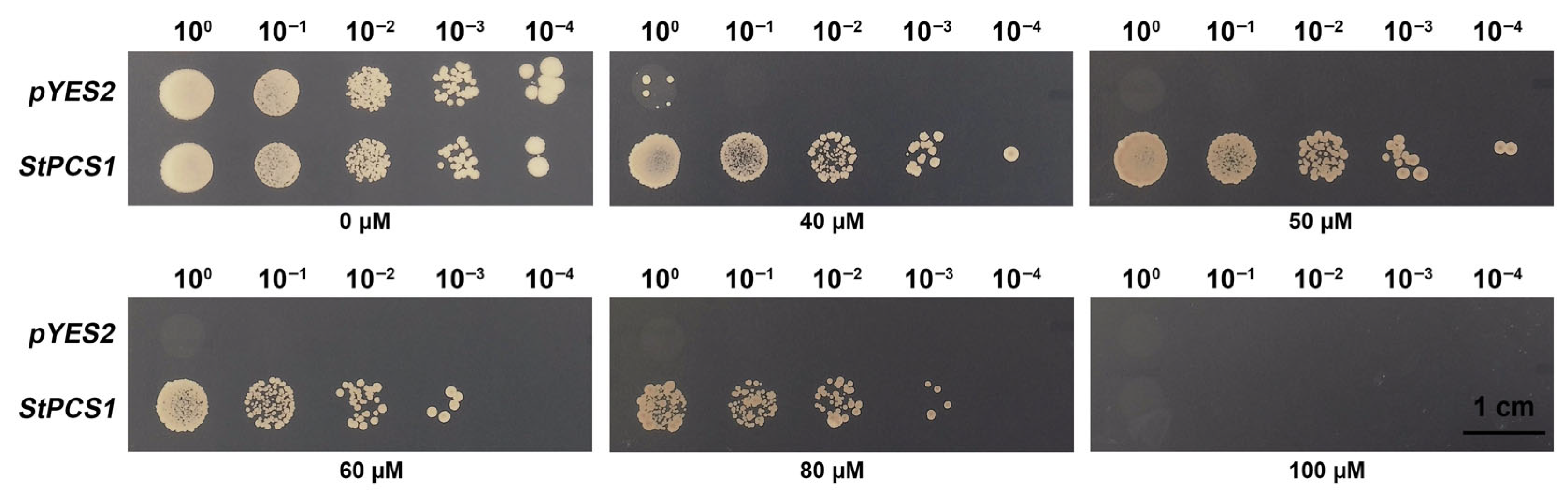 3.7. Overexpression of StPCS1 Gene Enhances Cd Tolerance in Transgenic Yeast