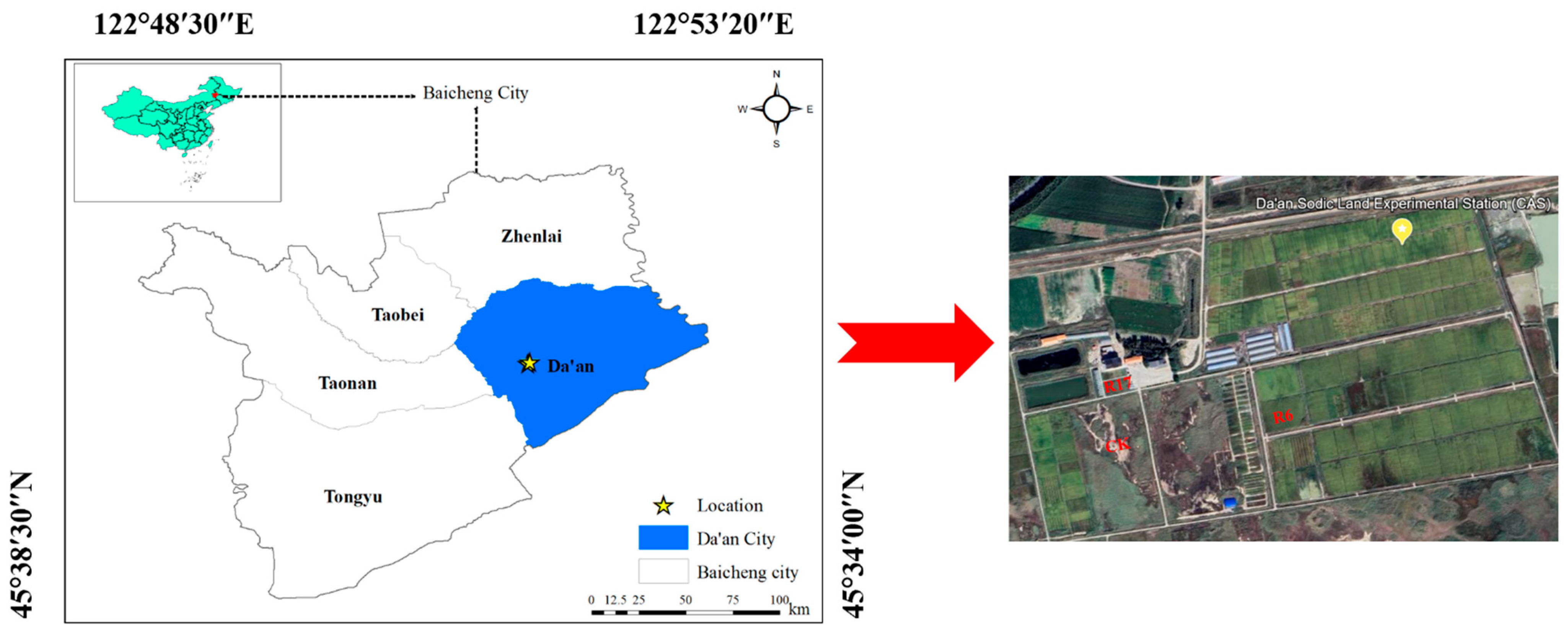- Peng, W.; Zhu, X.; Zheng, W.; Xie, Q.; Wang, M. Rice Cultivation Can Mitigate Soil Salinization and Alkalization by Modifying the Macropore Structure in Saline—Sodic Paddy Fields. Agric. Water Manag. 2025, 313, 109473. [Google Scholar] [CrossRef]