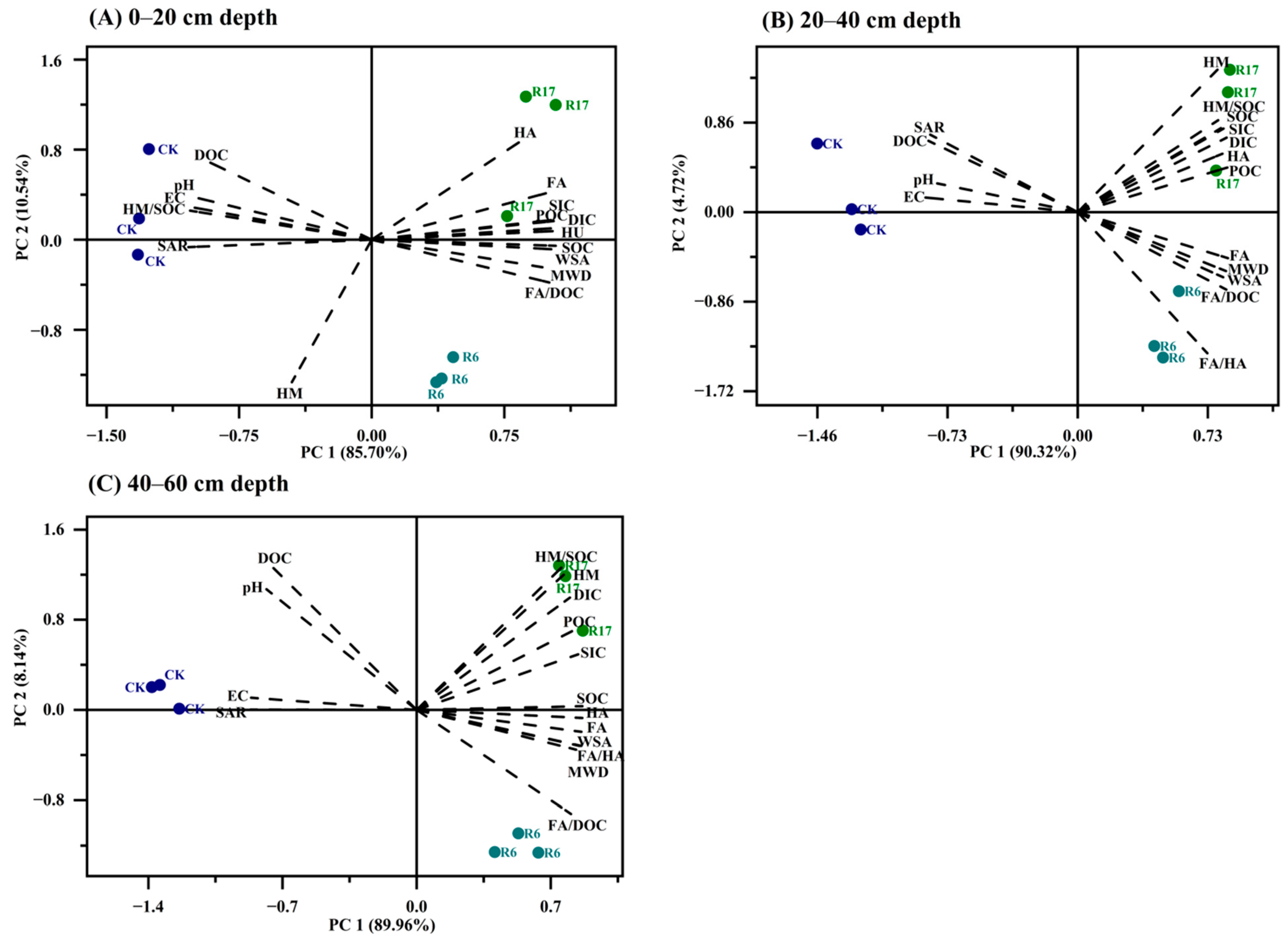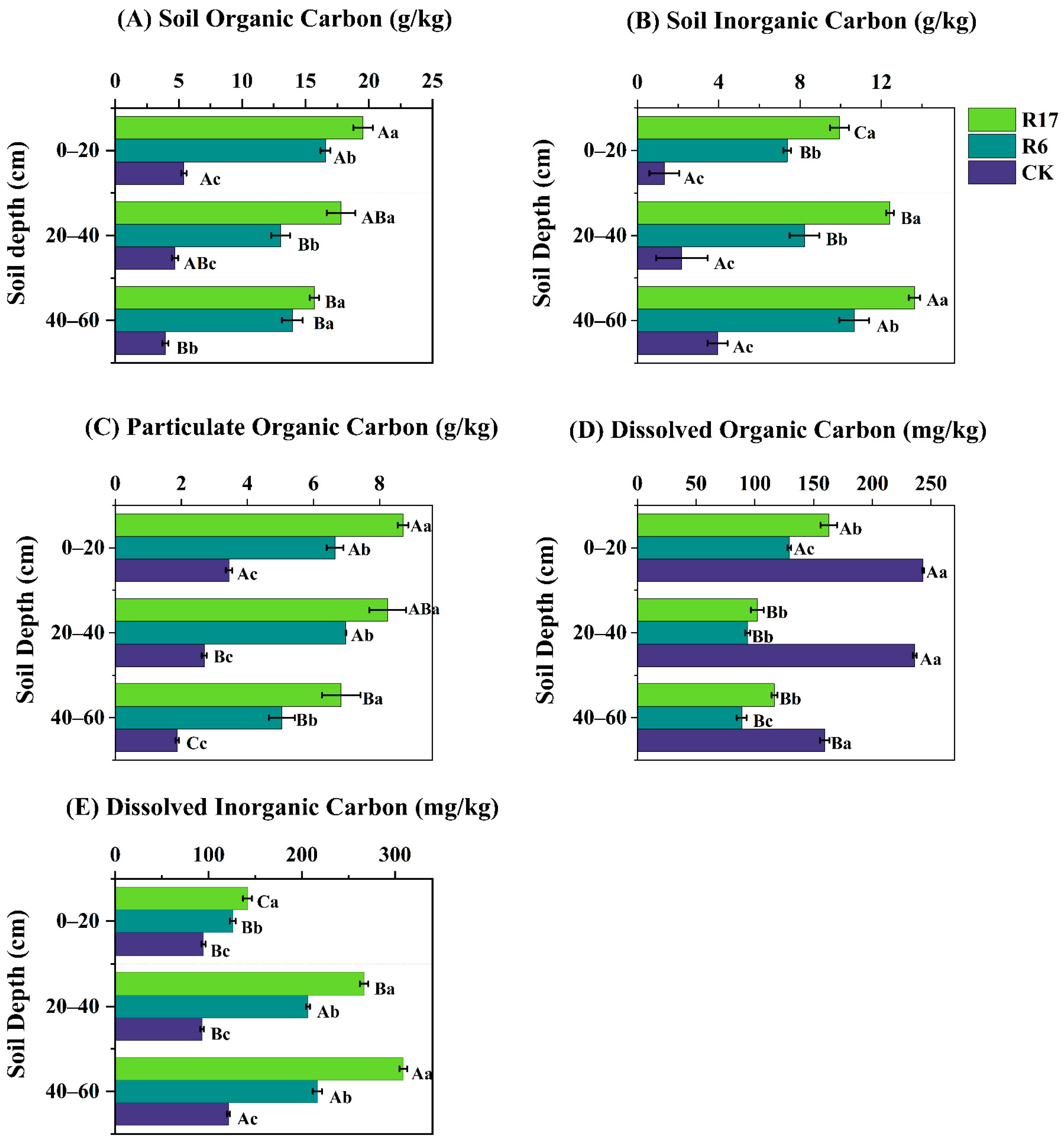 | 0–20 cm | R17 | 8.47 ± 0.02 Cb | 0.51 ± 0.11 Ab | 15.71 ± 0.45 Bc |