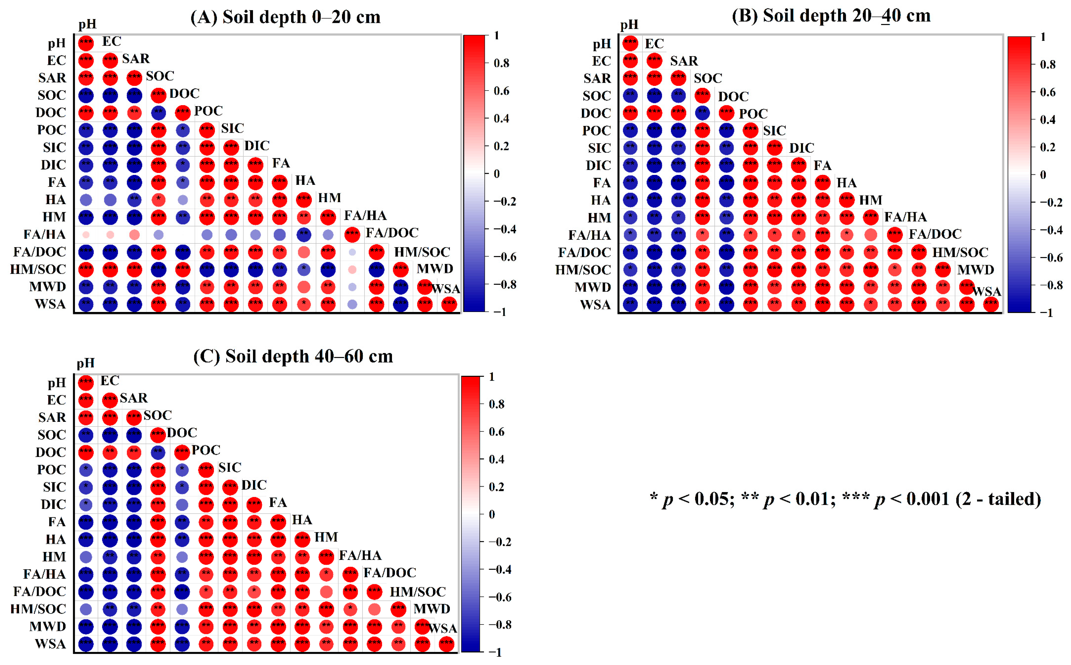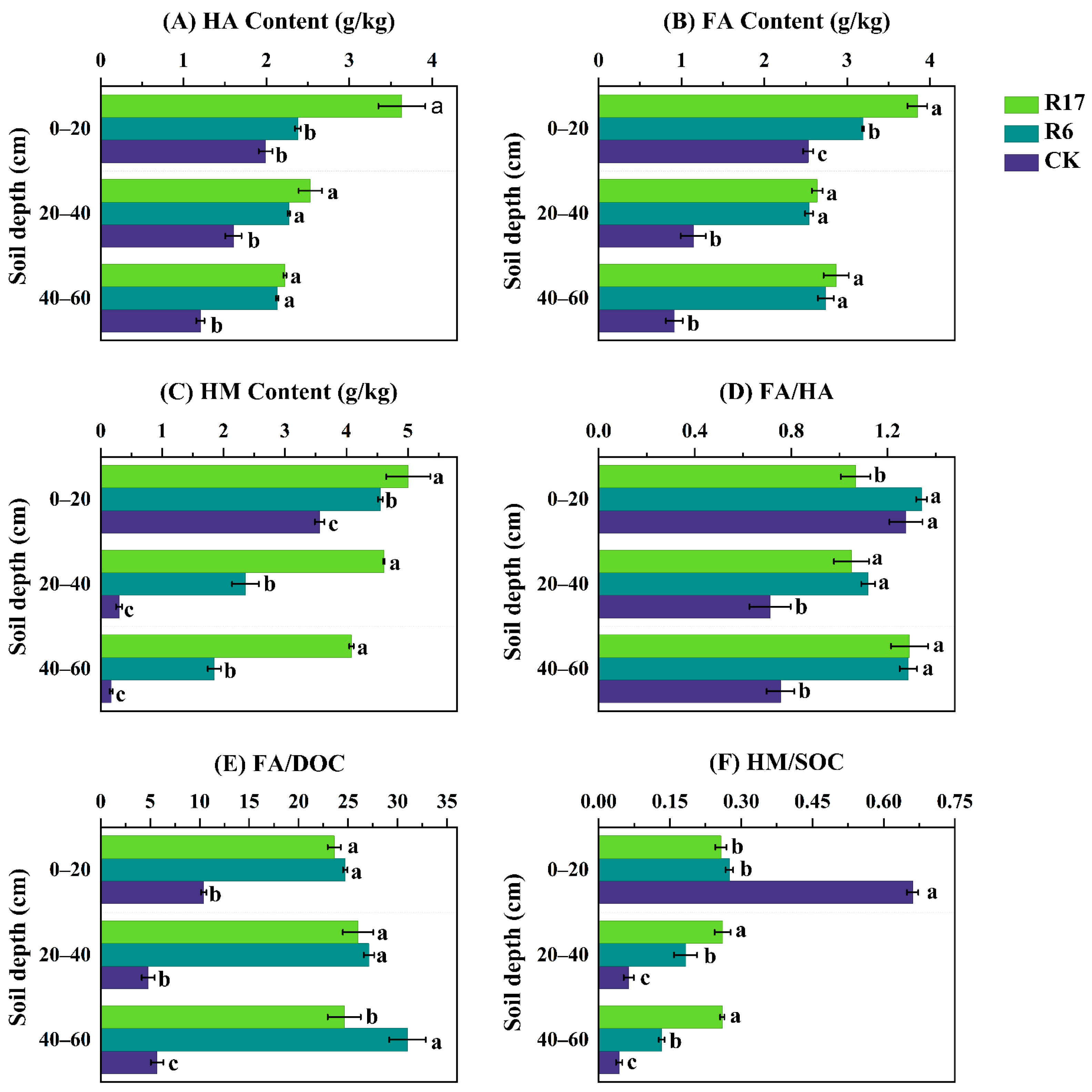 4.2. Vertical Transformation and Stabilization of Humic Substances in Saline–Sodic Paddy Fields