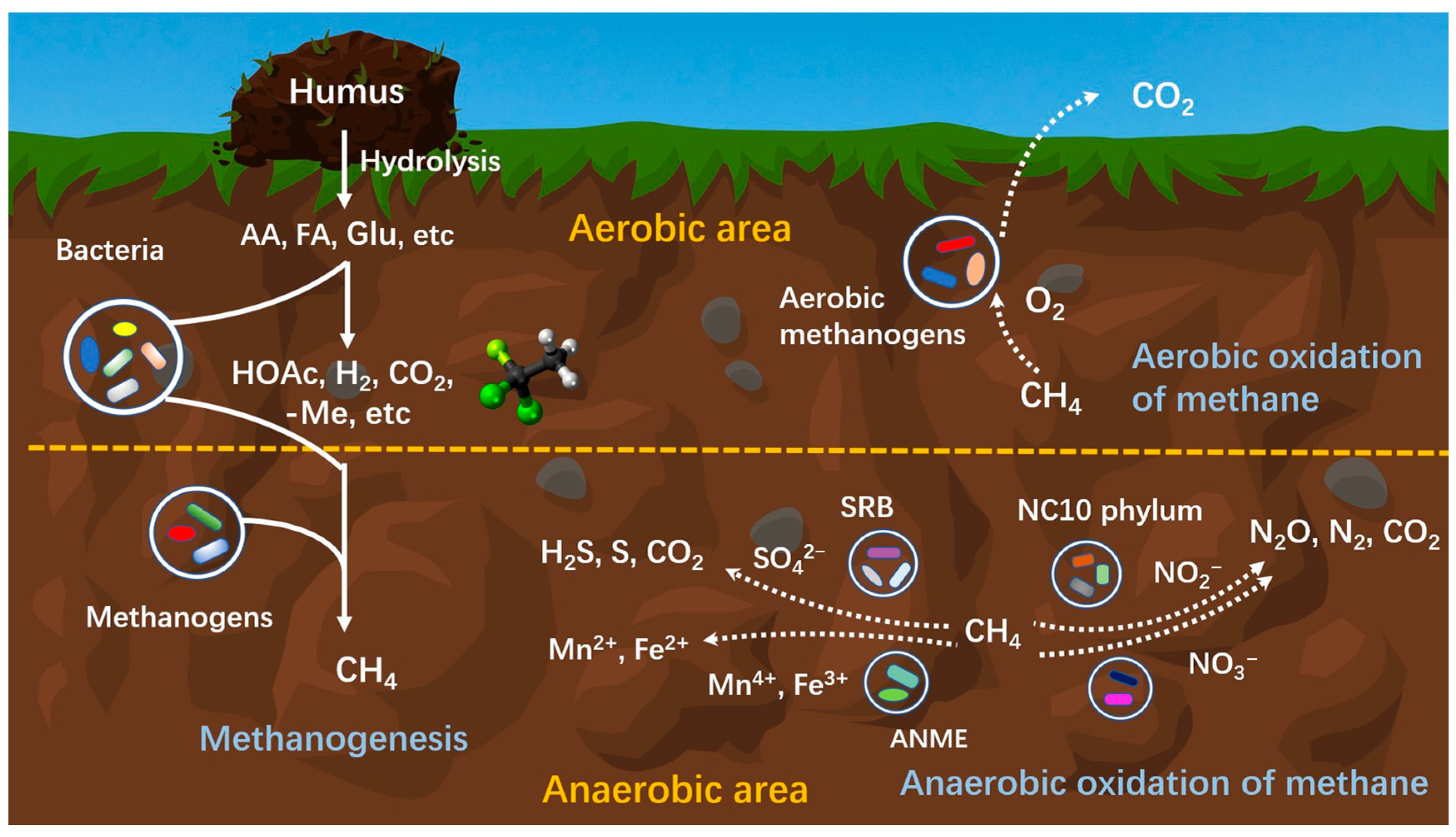 Schematic representation of CH4 production and oxidation processes in soil. The upper aerobic zone shows the oxidation of CH4 by aerobic methanotrophic bacteria using O2, with subsequent conversion of CH4 to CO2. The lower anaerobic zone involves methanogenesis, where organic matter (humus) is broken down by the bacteria into intermediates such as acetate (HOAc), hydrogen (H2), and CO2, which are used by methanogens to produce CH4. Anaerobic oxidation of methane (AOM) occurs in the anaerobic zone and utilizes sulfate (SO42−), nitrate (NO3−), and nitrite (NO2−) as electron acceptors through interactions with sulfate-reducing bacteria (SRB), ANME (anaerobic methanotrophic archaea), and NC10 phylum microbes. The role of metal ions (Mn2+, Fe2+, Mn4+, and Fe3+) and sulfur compounds in these processes is also shown.