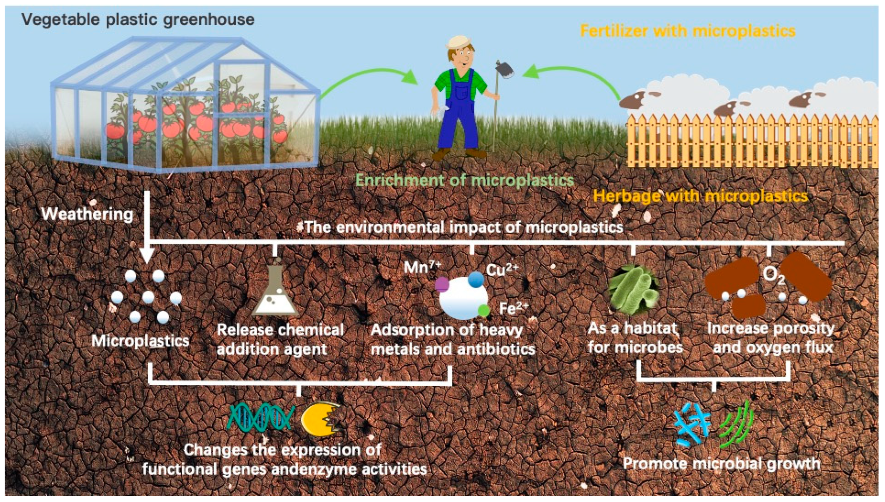 Environmental impacts of microplastics in agriculture. Shows that microplastics from sources such as greenhouse plastics can accumulate in the soil, release chemicals, adsorb pollutants, change soil properties, affect microbial activity and pose risks to ecosystems and health.