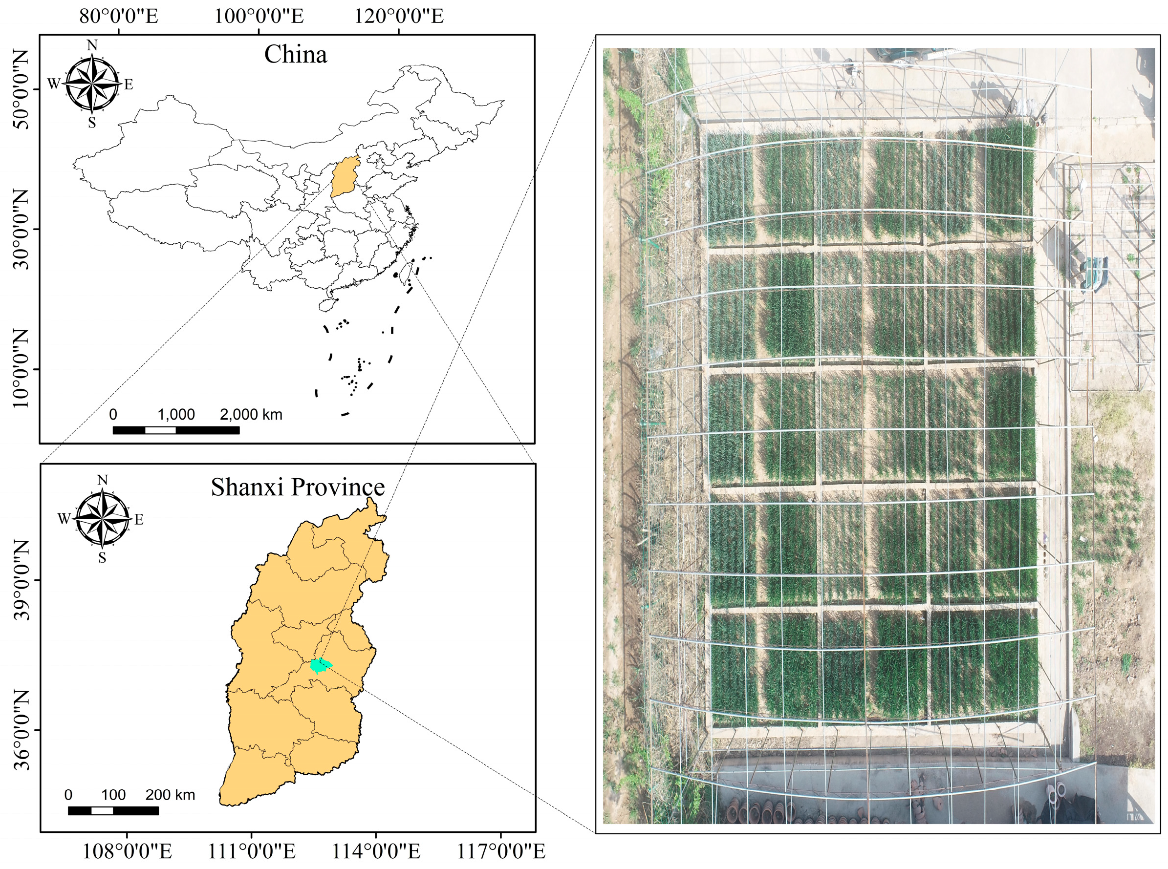 The experimental site is situated in Taigu District, Jinzhong City, Shanxi Province, China (112°34′19.96″ E, 37°25′19.81″ N), as illustrated in