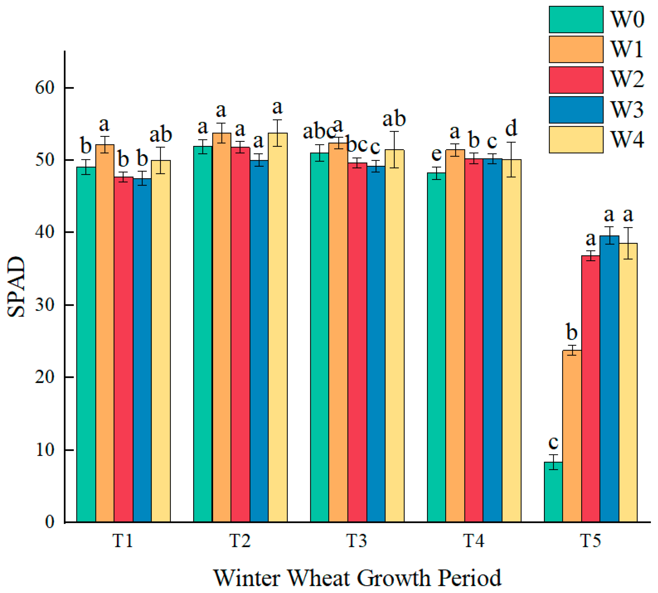Figure 3 illustrates the temporal variation in SPAD values of winter wheat over the course of the experimental period. As shown, the patterns of SPAD values dynamics exhibited slight differences across irrigation treatments during crop development. Overall, SPAD values initially increased, reaching a peak at the heading stage, followed by a gradual decline. During the flowering and grain filling stages, SPAD values remained relatively stable, whereas a more pronounced decrease occurred during the maturation stage. Despite these temporal trends, differences among treatments were generally not statistically significant, and the overall variation patterns appeared inconsistent. Following the initial irrigation, only the W1 treatment exhibited higher SPAD values compared to the W0 control. At the heading stage, no statistically significant differences were observed among the W1, W2, W3, and W4 treatments.