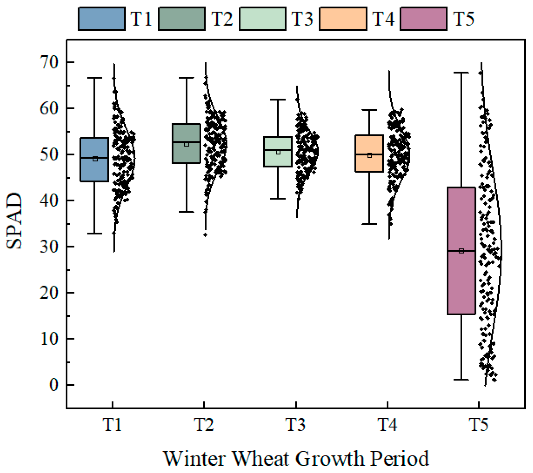To illustrate the temporal dynamics of SPAD values across different growth stages of winter wheat, a descriptive statistical plot of the SPAD value measurements is provided in