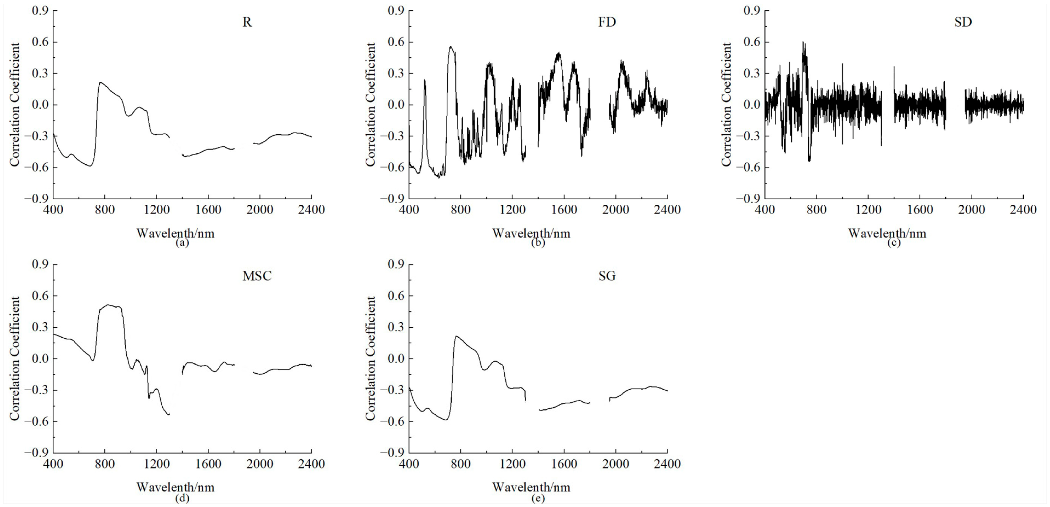 Figure 5. As shown, the SG-transformed spectral reflectance exhibits a correlation coefficient with SPAD values that closely mirrors that of the original spectrum. In contrast, the MSC transformation yields a coefficient correlation trend that is largely opposite to that of the original spectrum. The FD and SD transformations, however, result in entirely different trends in the correlation coefficient compared to the original curve.