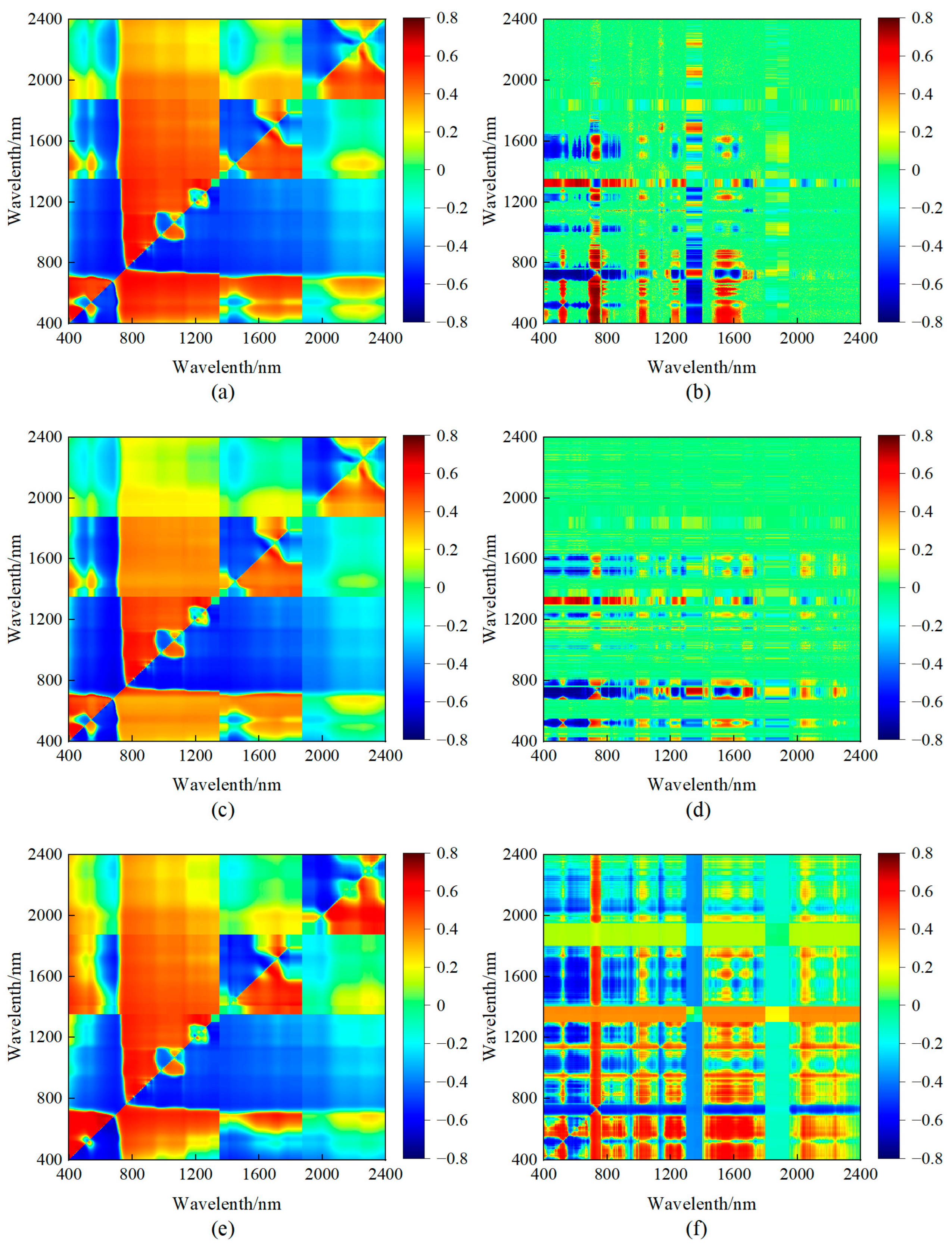 In this study, the correlation matrix method was employed to determine the optimal wavelength combinations for five spectral vegetation indices. For each index, all possible two-band wavelength combinations within the hyperspectral range were computed and individually correlated with SPAD values, and a correlation heat map was plotted, as shown in
