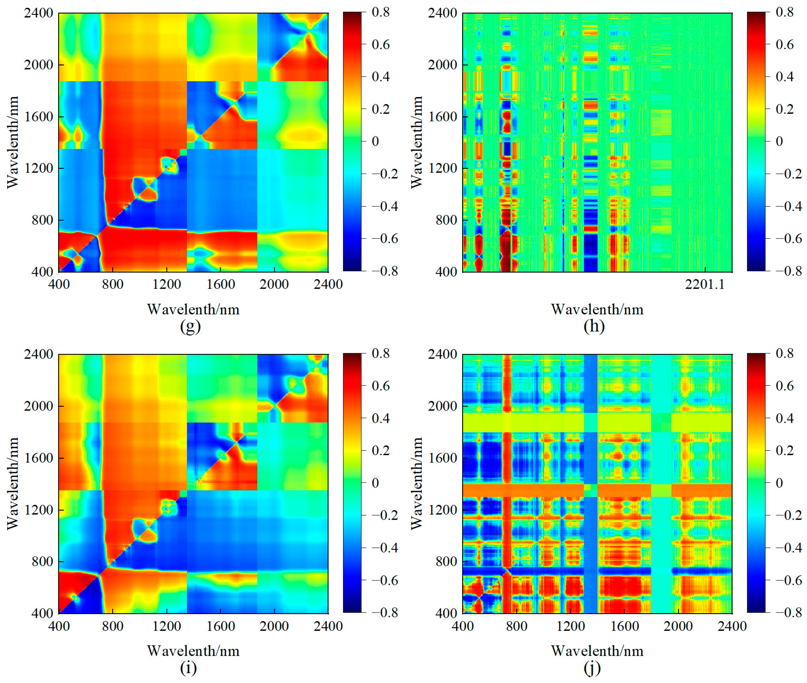 Figure 6. In the heat map, color gradients from blue to red represent correlation values ranging from −1 to +1. Optimal wavelength combinations were identified as those producing the maximum absolute correlation coefficient (|r|) for each index, with specific wavelength pairs (λ