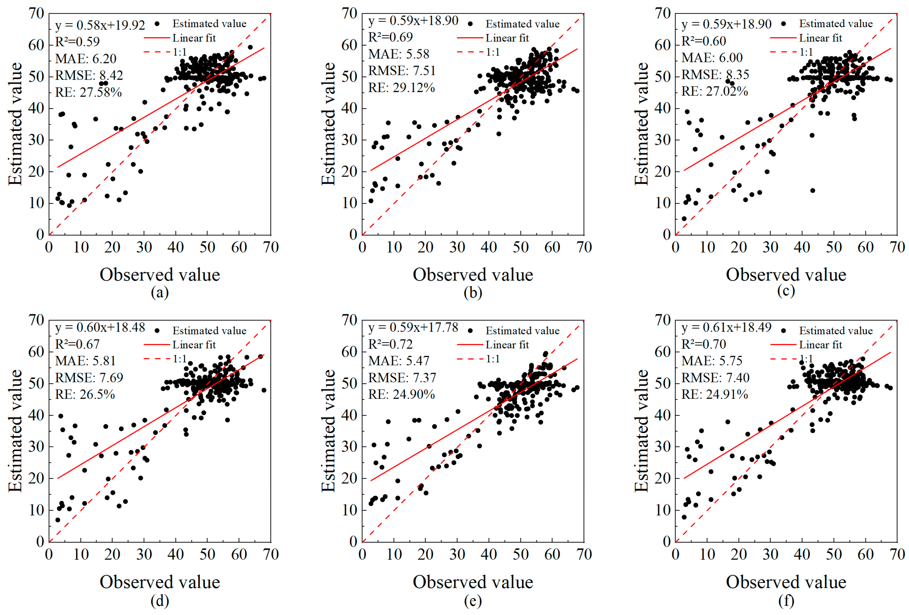 2 = 0.55 to 0.72, RMSE = 7.35 to 8.89, and RE = 24.91% to 31.93%, as shown in