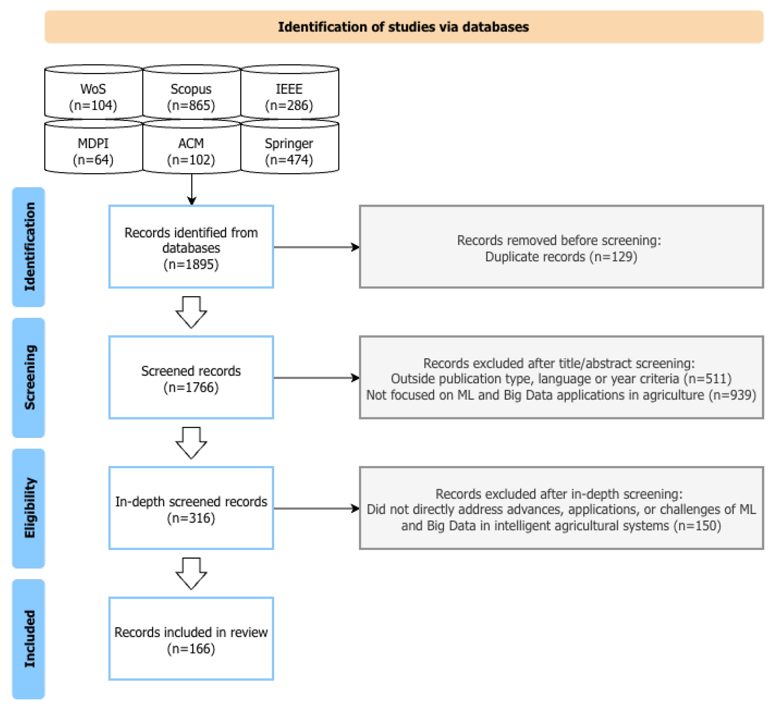 APA StyleCravero, A., Sepúlveda, S., Gutiérrez, F., & Muñoz, L. (2026). From Precision Agriculture to Intelligent Agricultural Ecosystems: A Systematic Review of Machine Learning and Big Data Applications. Agronomy, 16(5), 516. https://doi.org/10.3390/agronomy16050516