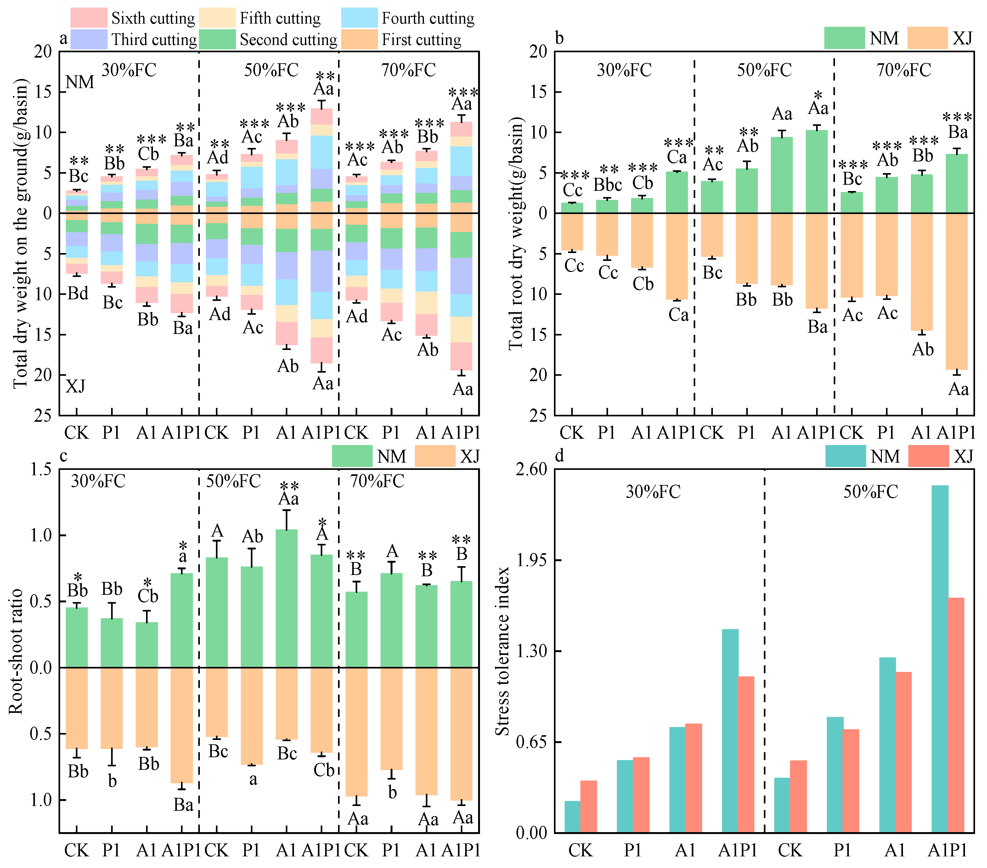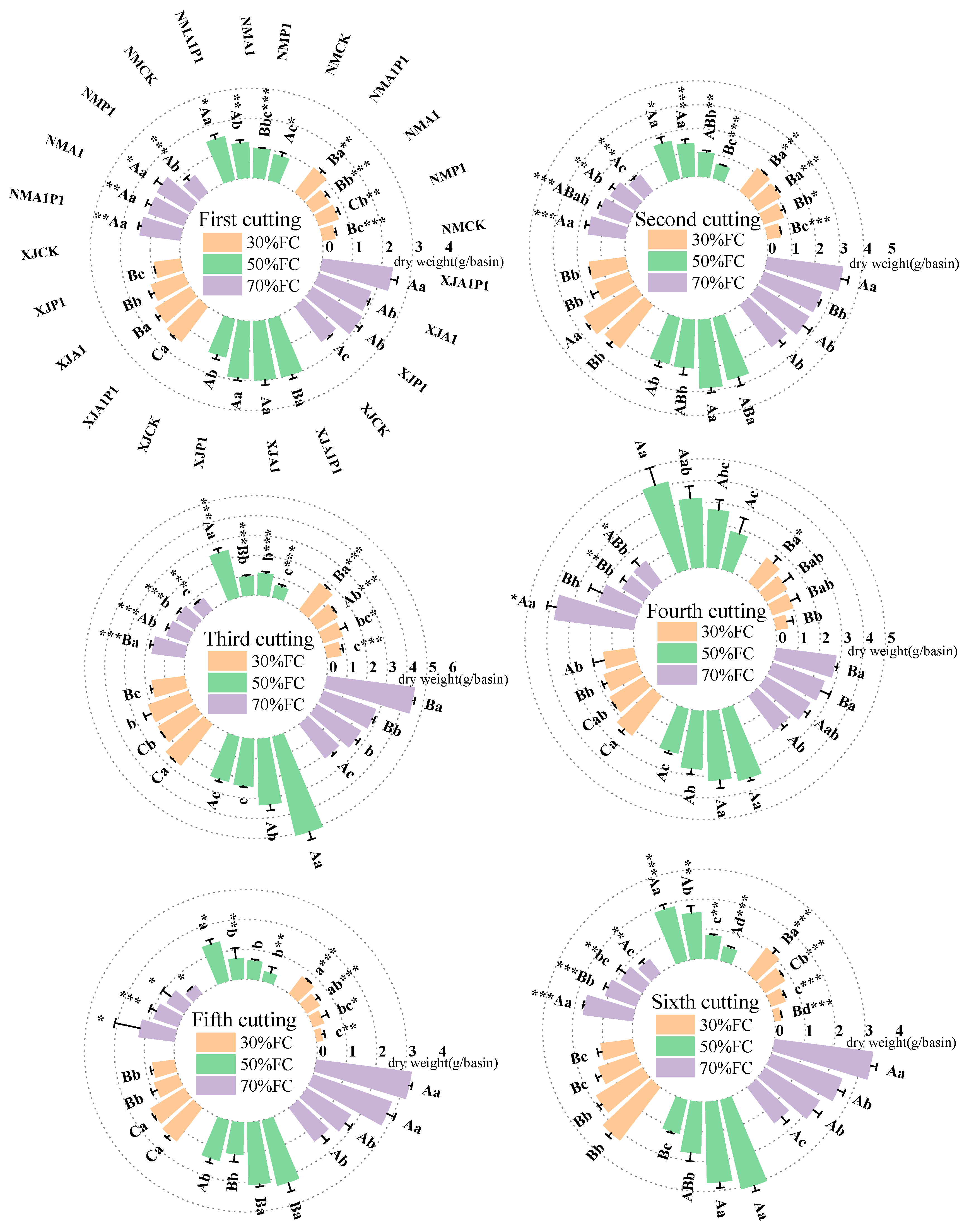 | 30% FC | CK | 372.95 ± 65.71 Bd** | 654.10 ± 69.15 Bc | 143.35 ± 17.55 Bc** | 268.34 ± 36.59 Cb | 20.28 ± 2.50 Bc* | 29.53 ± 2.78 Cd | 1.37 ± 0.02 Cb*** | 1.48 ± 0.01 Cb | 0.76 ± 0.10 Bc | 0.76 ± 0.06 Bb |