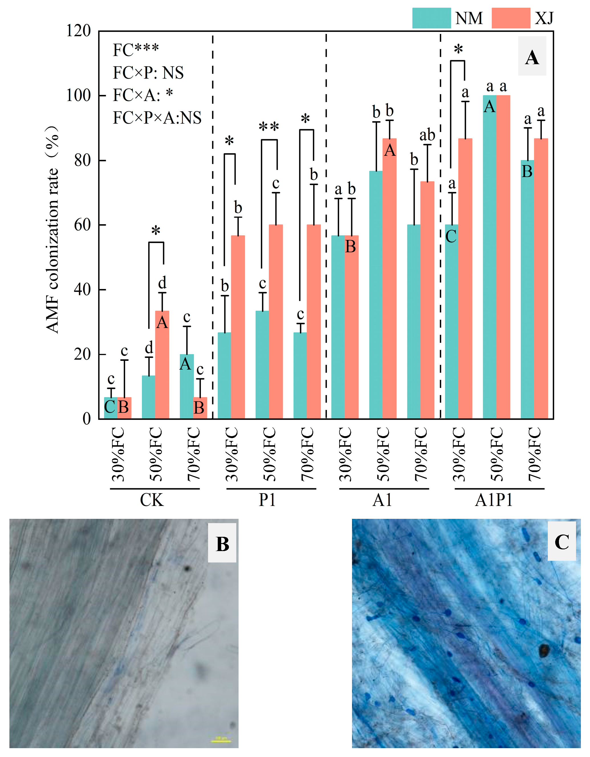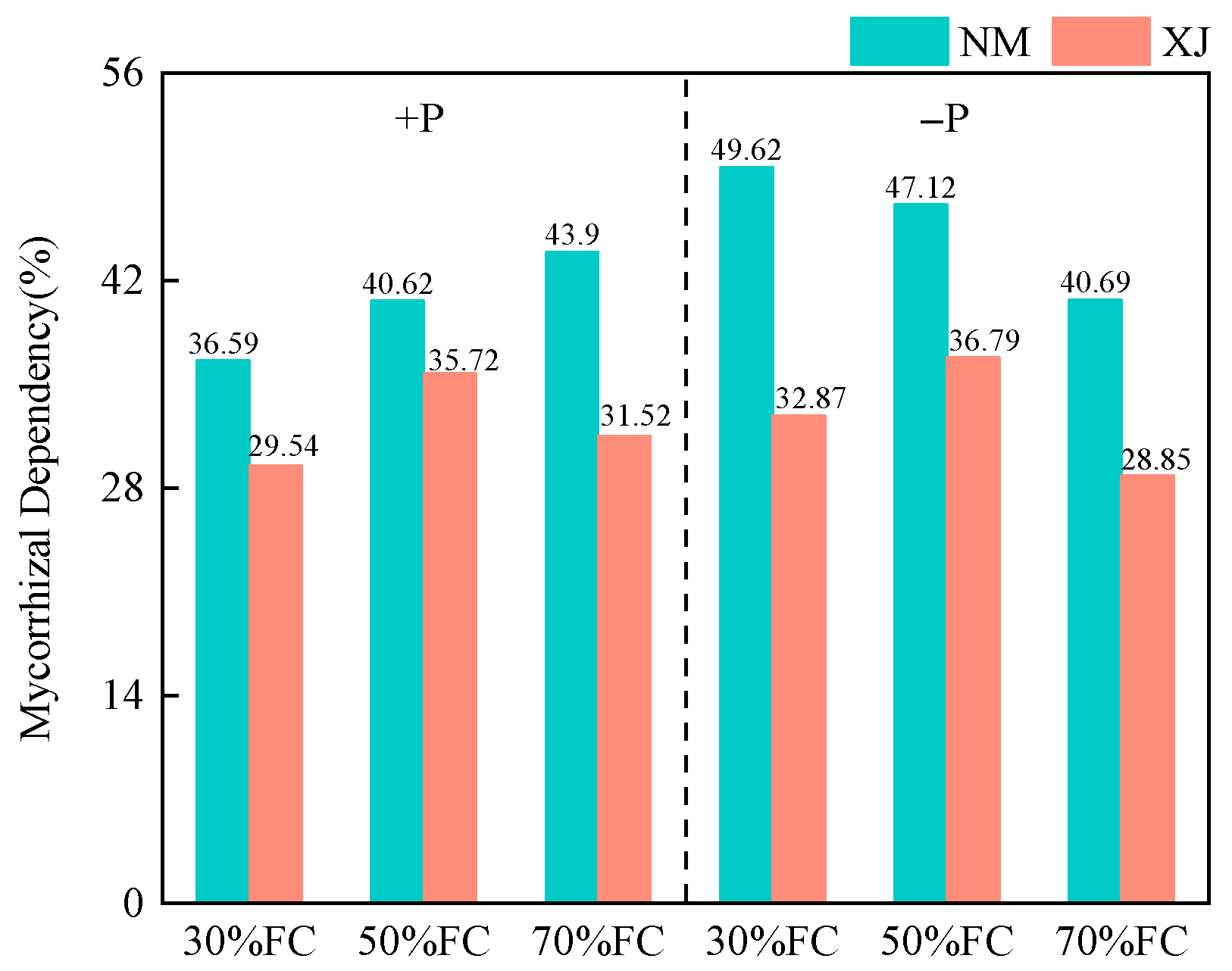 4.1. Interactive Regulation of AMF Colonization by Water and Phosphorus