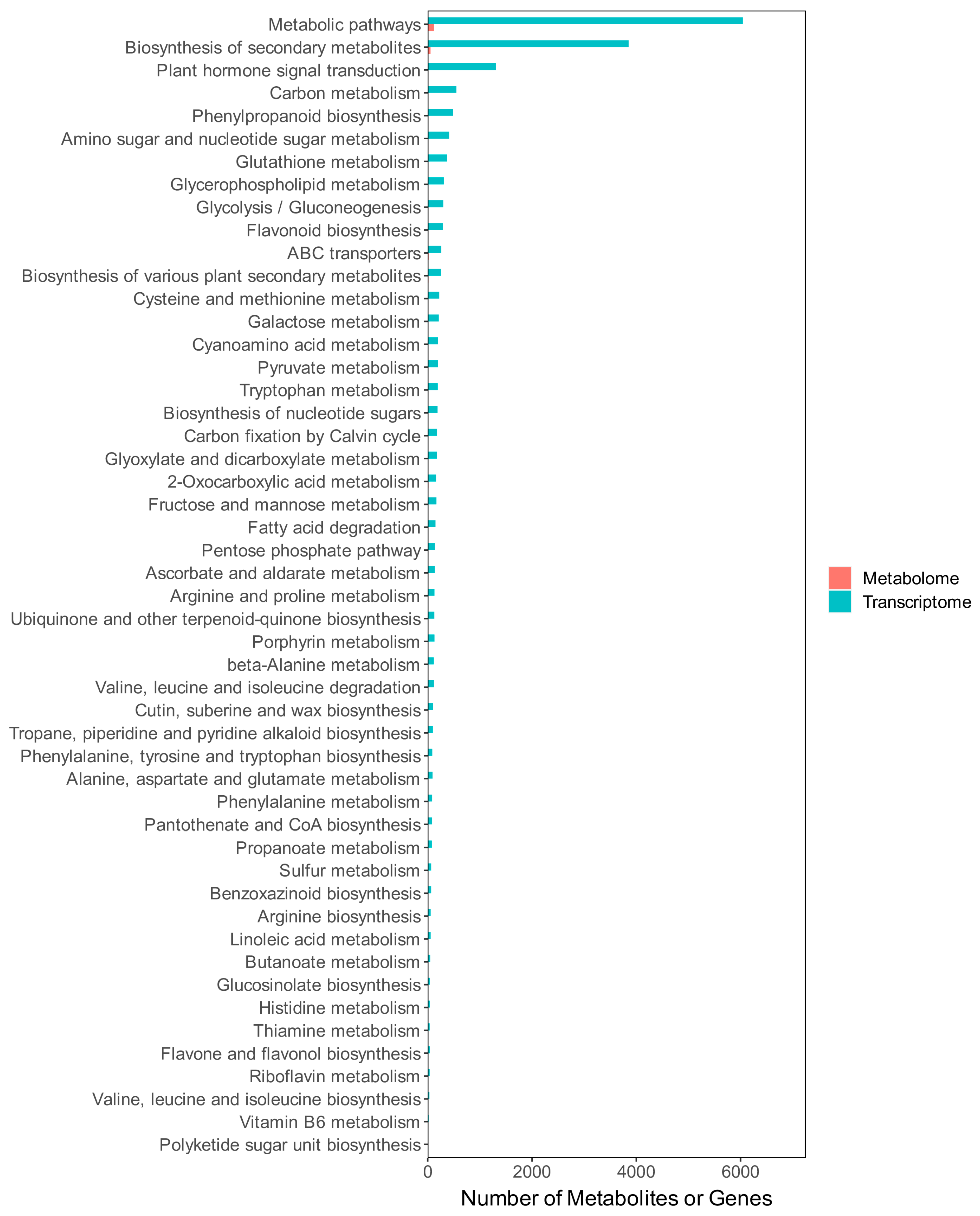 3.3. Integrated Analysis of Transcriptome and Metabolome