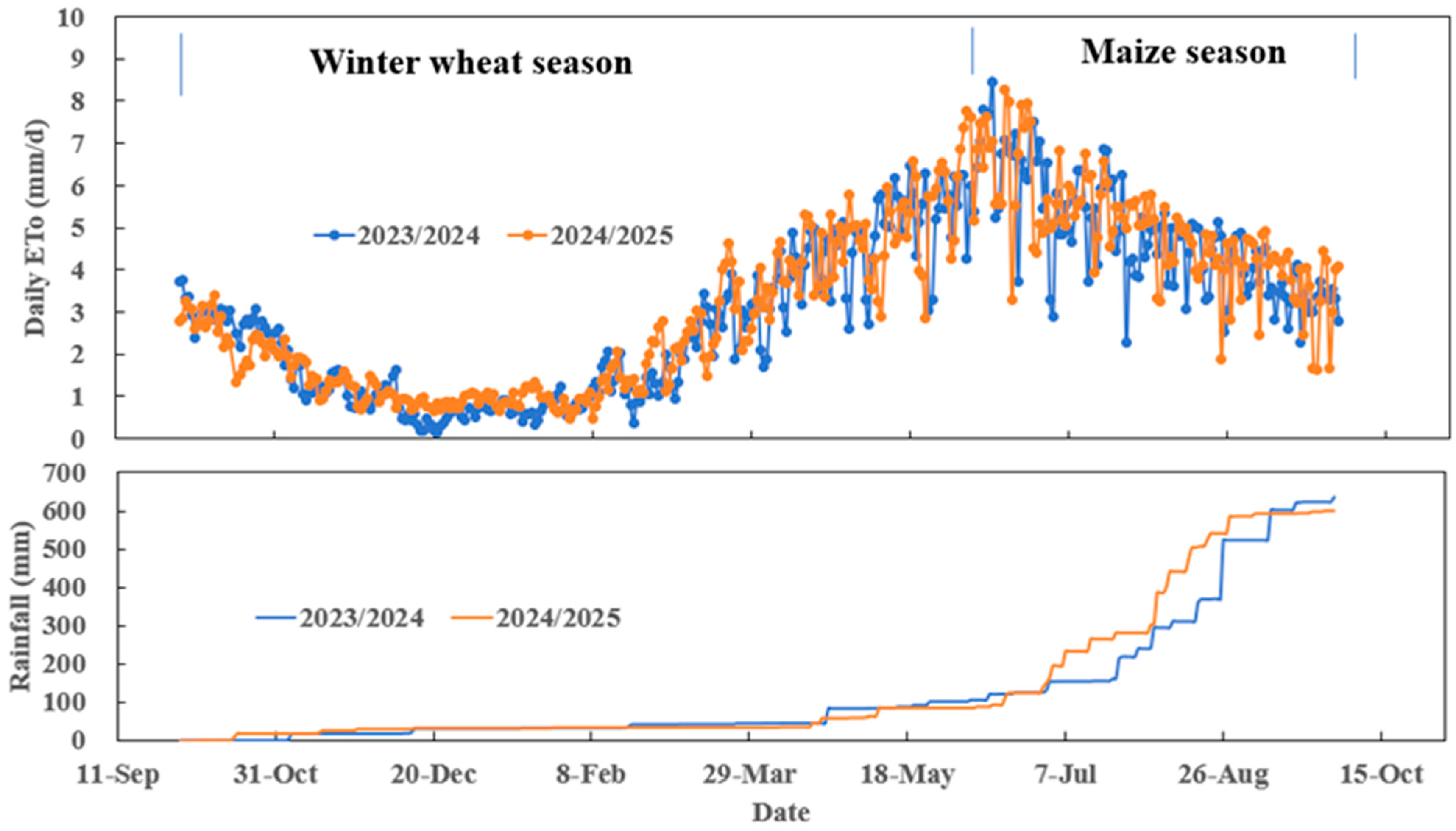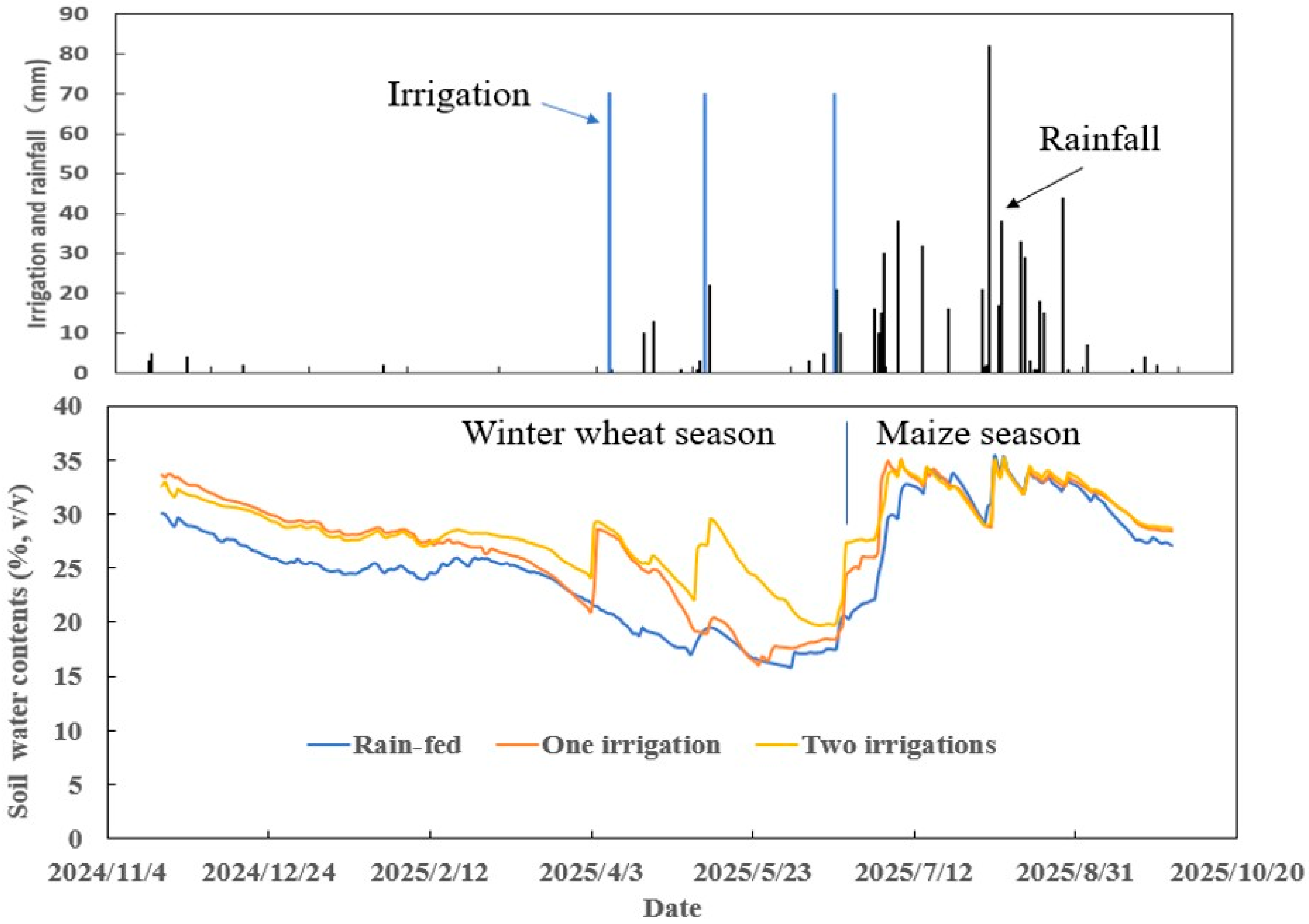 | Rainfed (I0) | No irrigation during winter wheat season, as the control representing a serious water shortage situation | Irrigation of 70 mm at maize sowing to ensure seedling establishment for all treatments |