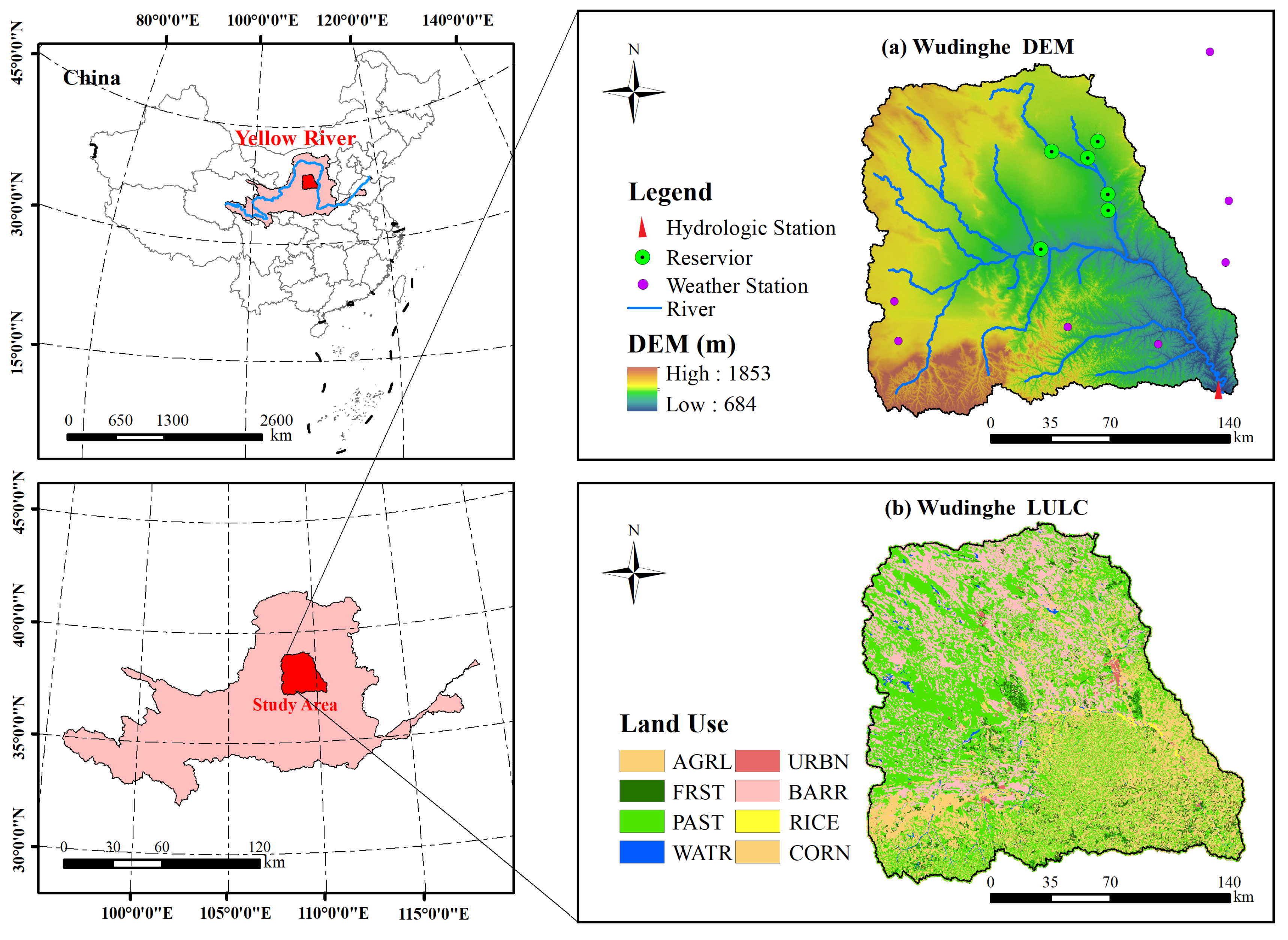 - Zhang, Q.Y.; Wu, J.H.; Liu, W.B.; Wang, T.L.; Wang, Y.C. SWAT plus Model Enhanced with Dynamic Phenology Remote Sensing and High-Precision Precipitation Data for Water Resource Vulnerability Assessment in Semi-Arid Regions. Water Resour. Manag. 2025, 39, 4947–4969. [Google Scholar] [CrossRef]