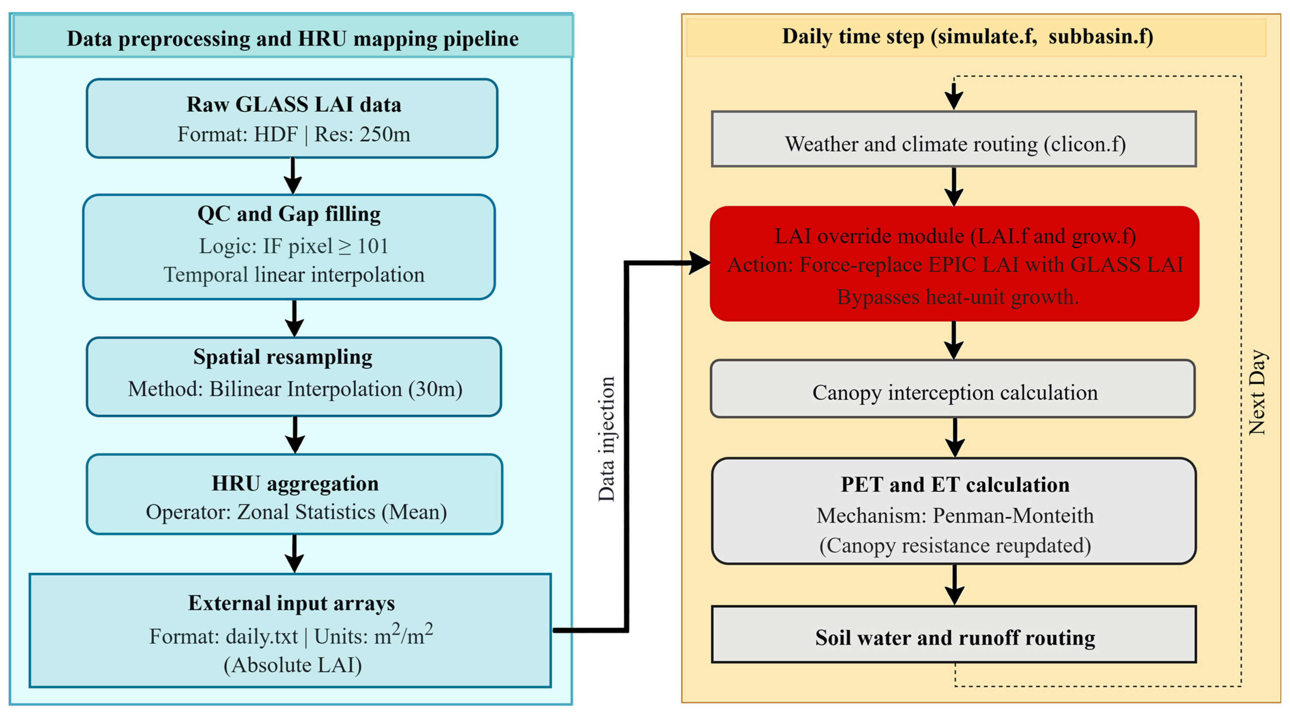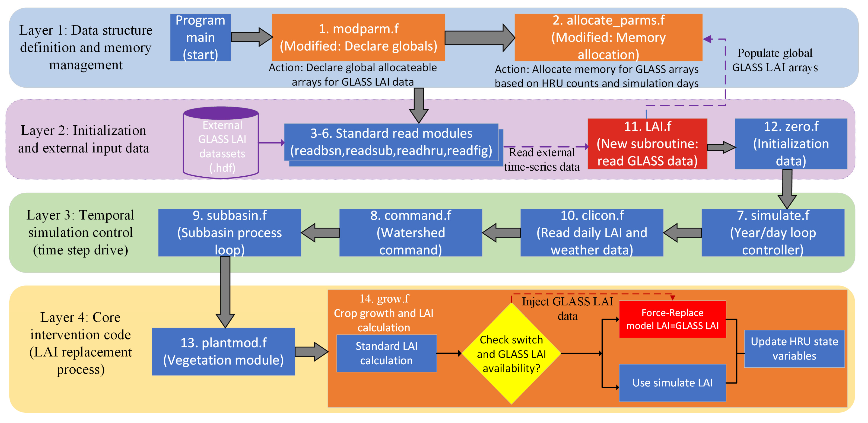 | grow.f | Modified | Injected logic to force-replace the EPIC-calculated LAI with GLASS LAI data. |