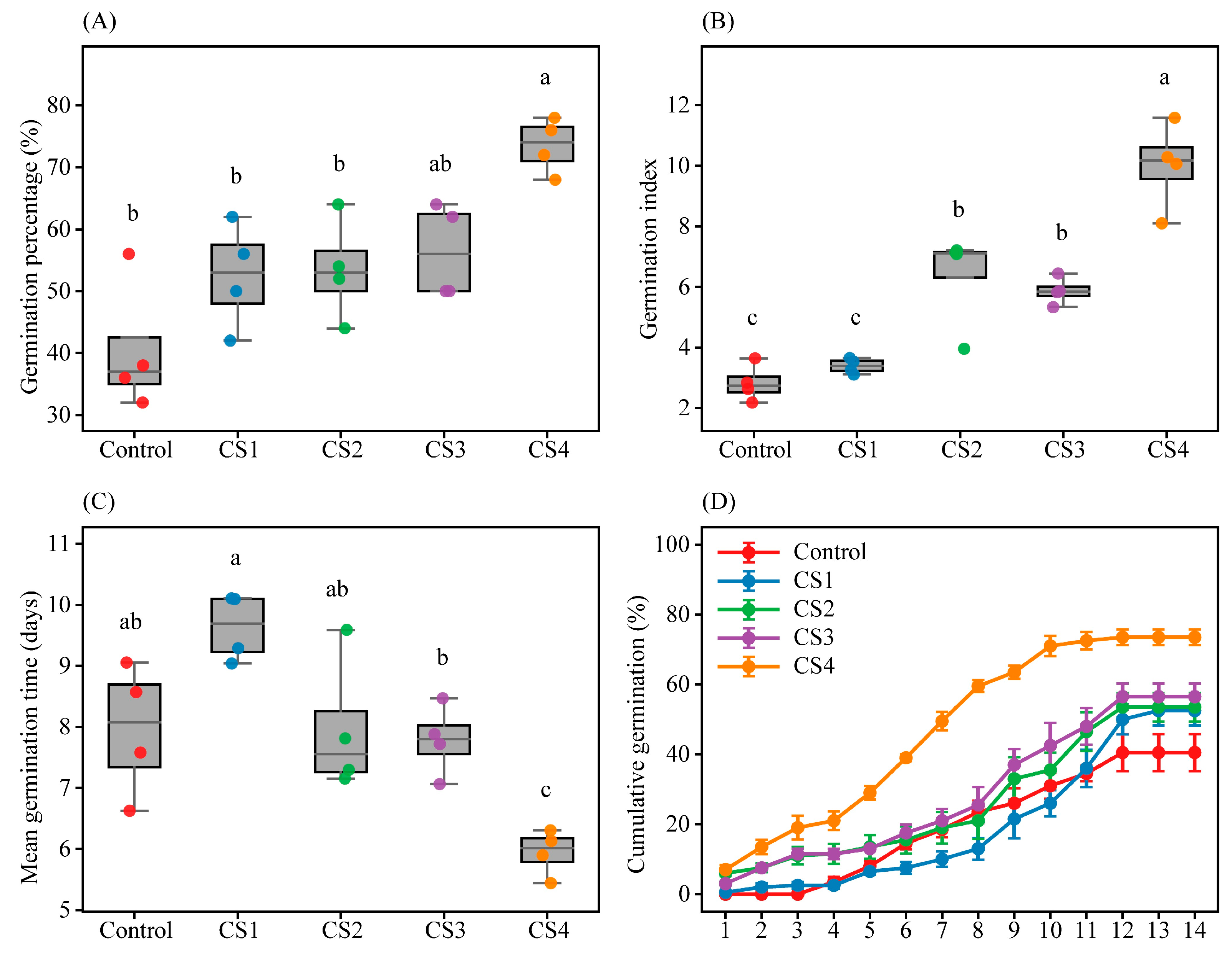 Figure 1A). One-way ANOVA followed by Tukey’s test indicated that CS4 was significantly higher than the Control and the shorter moist chilling treatments (as indicated by distinct letters;