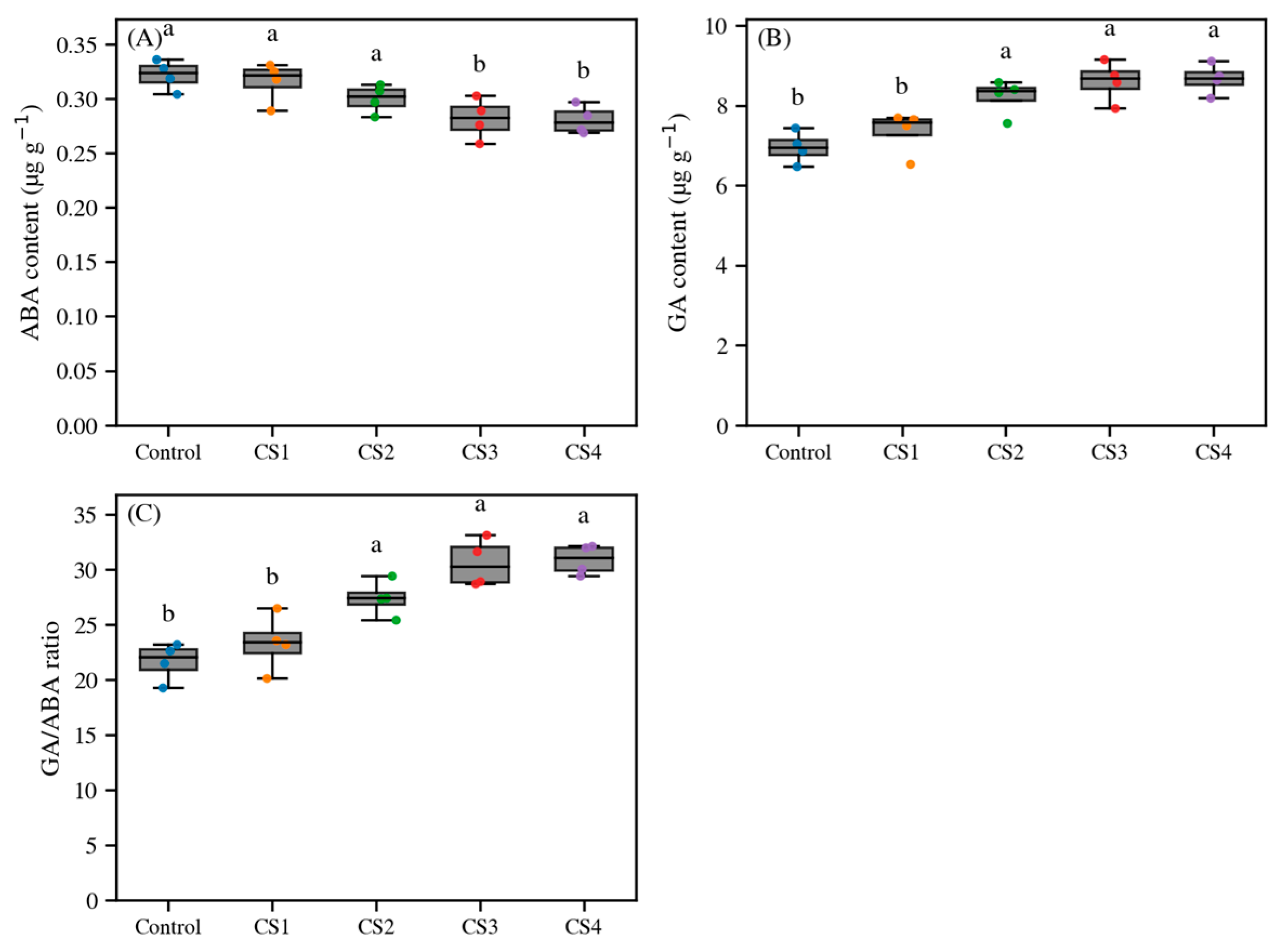 Consistent with the opposite trends of ABA and GA, the GA/ABA ratio rose markedly after moist chilling. The ratio in CS2–CS4 was significantly elevated relative to Control and CS1 (