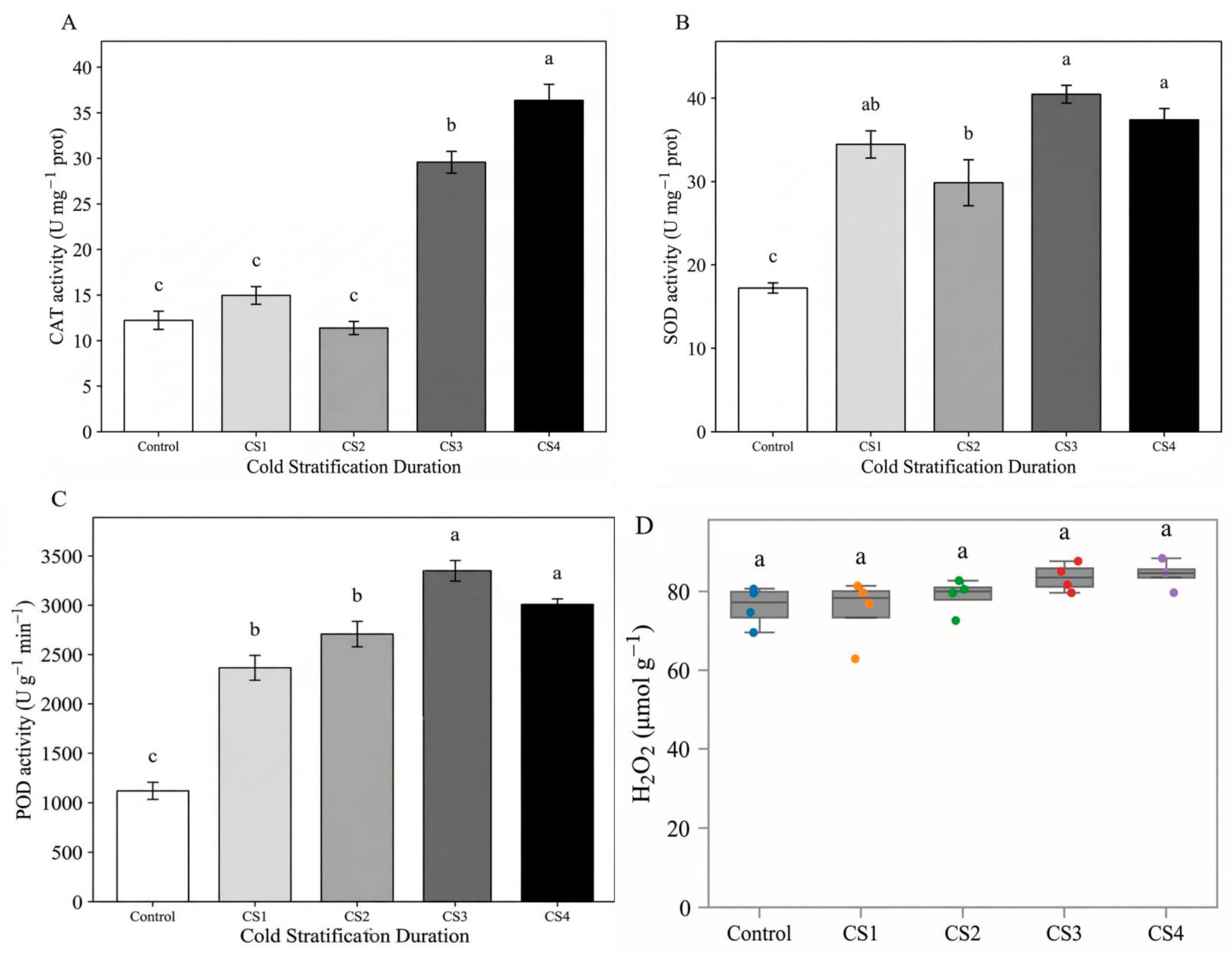 Figure 5C), with Control remaining lower than the moist chilling treatments. In this trait, the increase appeared to plateau relatively early: CS1–CS4 generally clustered at higher levels than Control, with limited separation among the moist chilling durations (different letters,