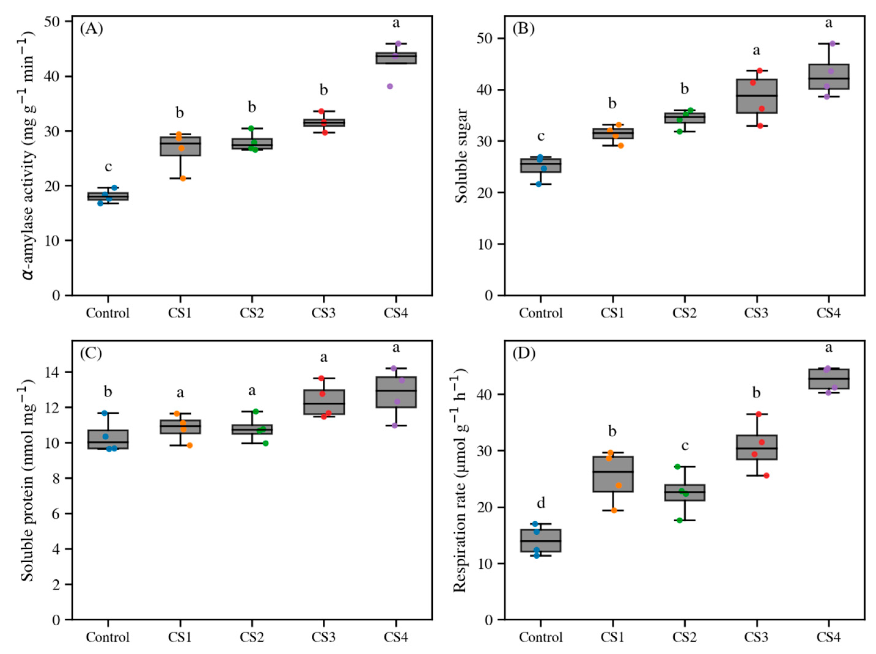 Figure 5A). Notably, CS1–CS3 formed an intermediate group that did not differ significantly from one another, whereas CS4 displayed the highest α-amylase activity and was significantly greater than the other treatments (different letters,