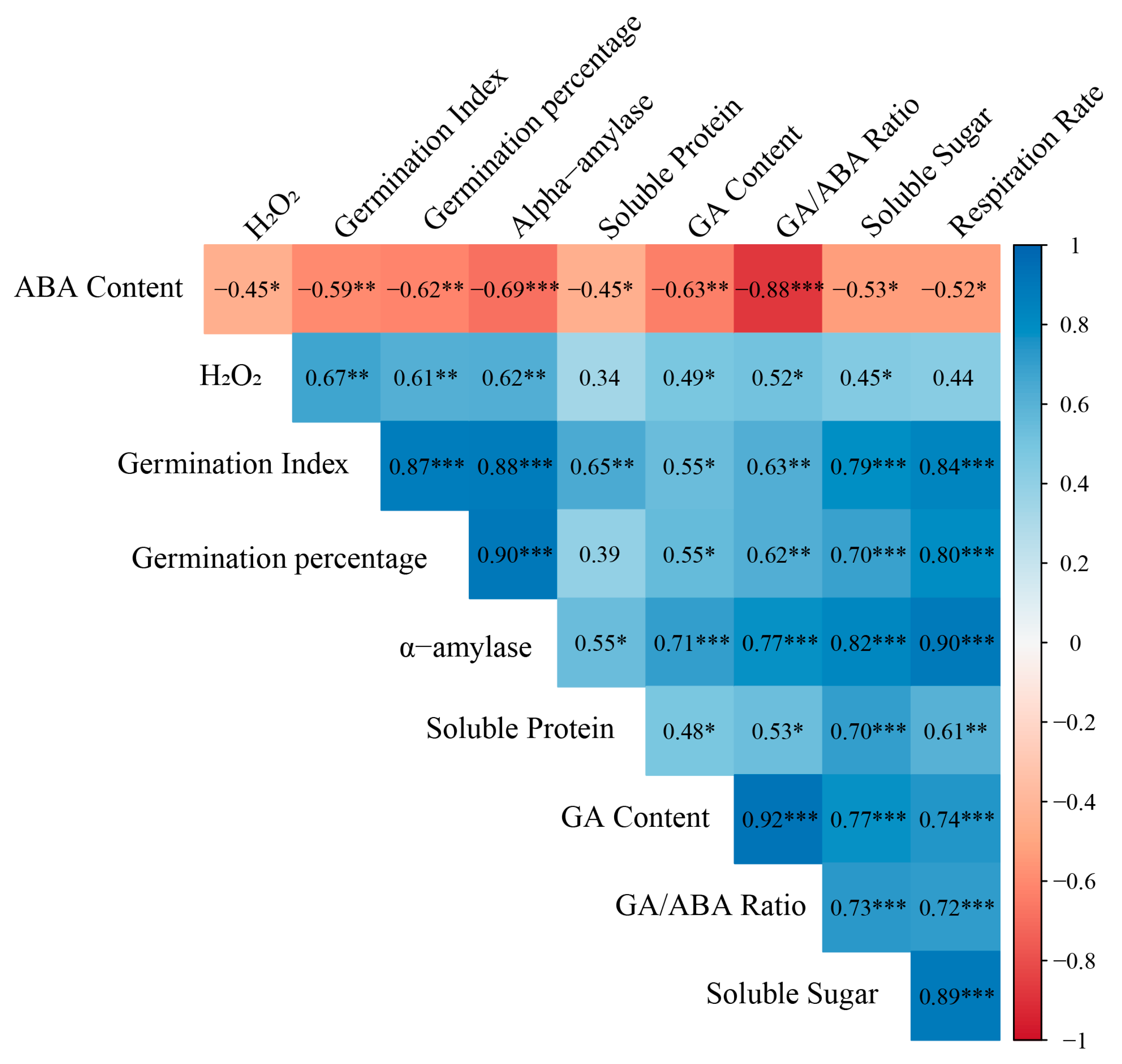 The correlation matrix provides systems-level support for this integrated interpretation. Germination traits were internally coherent, and germination performance aligned most strongly with metabolic activation, particularly α-amylase activity and respiration, consistent with reserve mobilization and bioenergetic capacity acting as close determinants of germination speed. Hormone balance—especially the GA/ABA ratio—emerged as a key upstream correlate, while ABA tended to associate negatively with germination performance, consistent with classical hormone control of dormancy release [