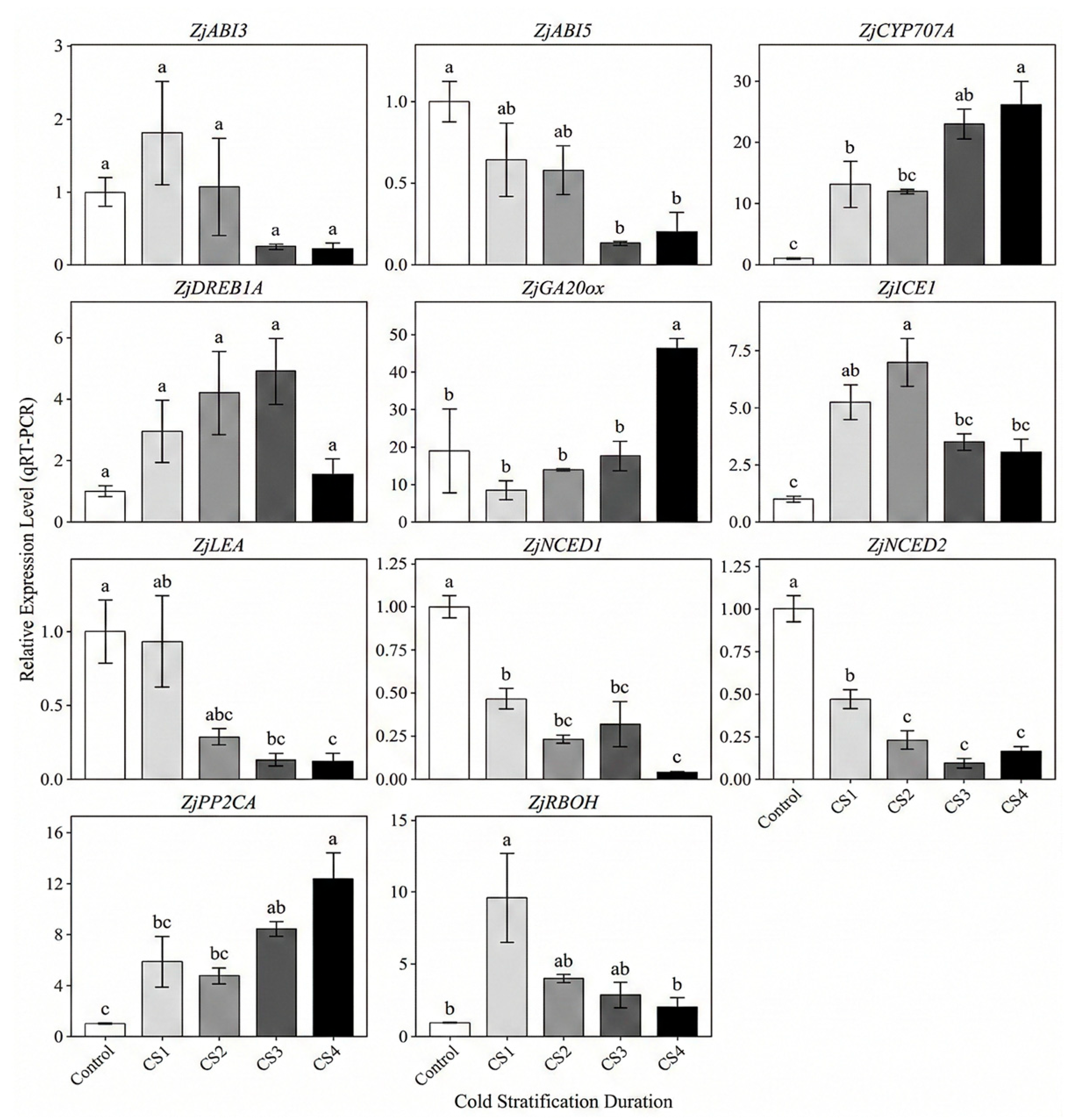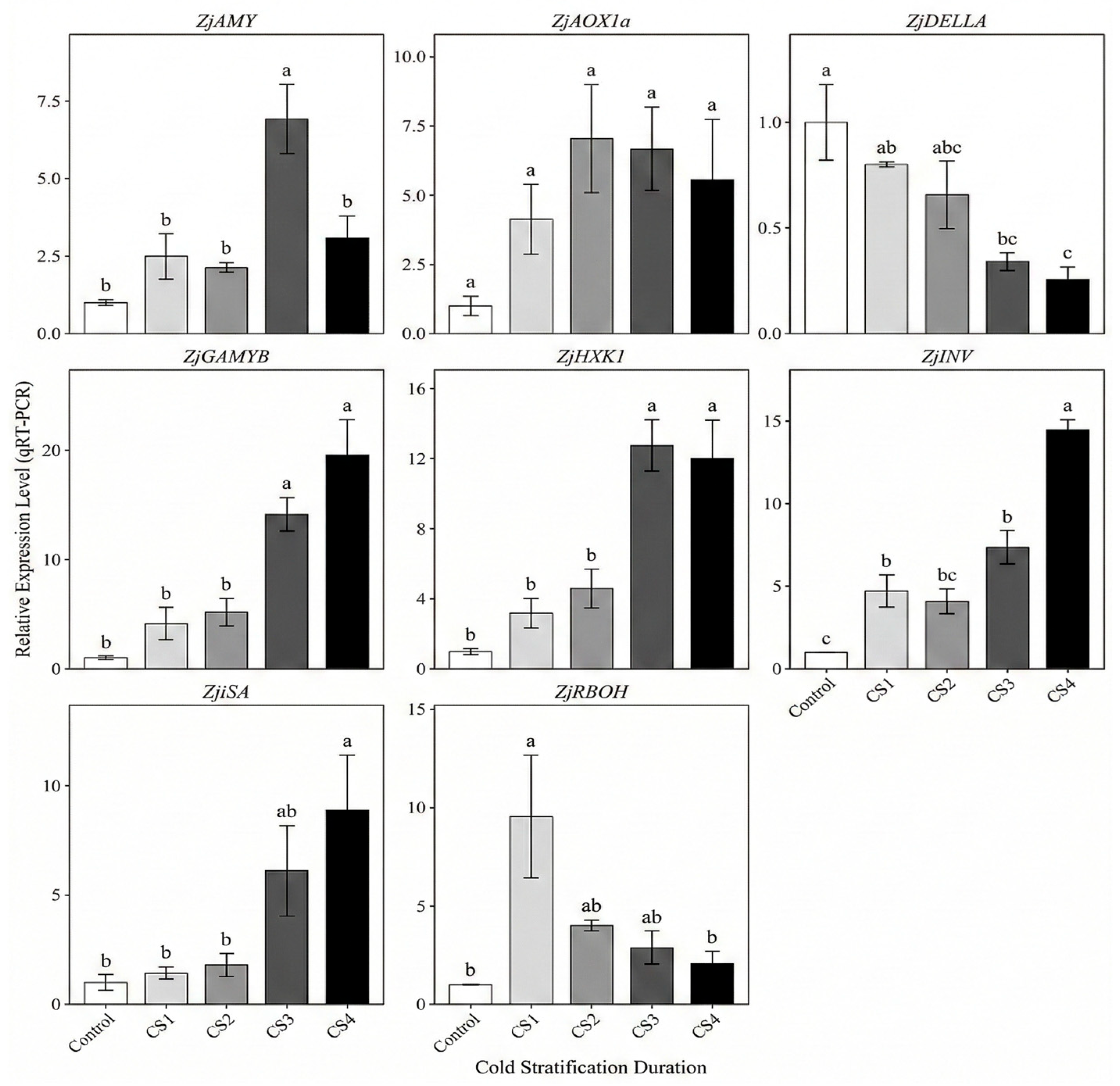 ZjGAMYB remained at relatively low levels from Control to CS2, but was strongly induced after prolonged moist chilling, showing significantly higher expression in CS3–CS4 than in Control–CS2 (
