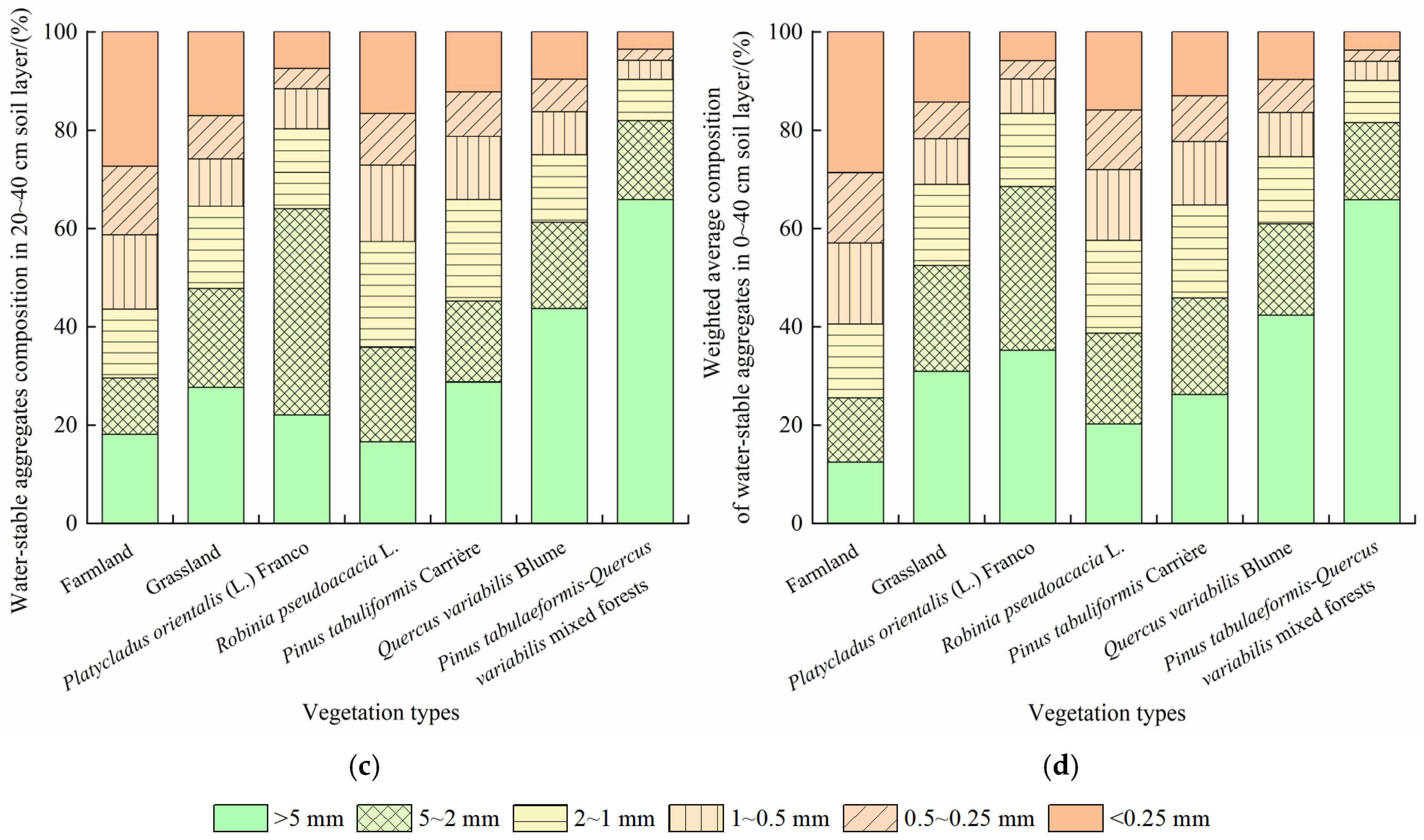 - Vegetation restoration significantly enhances soil aggregate stability compared to farmland, with forest ecosystems exhibiting superior performance. Among the studied vegetation types, Pinus tabulaeformis-Quercus variabilis mixed forests demonstrated the highest proportion of macroaggregates (>0.25 mm) and the most stable soil structure across all soil depths (0–40 cm), highlighting the advantage of mixed-species systems over monoculture plantations in restoring soil structural integrity.