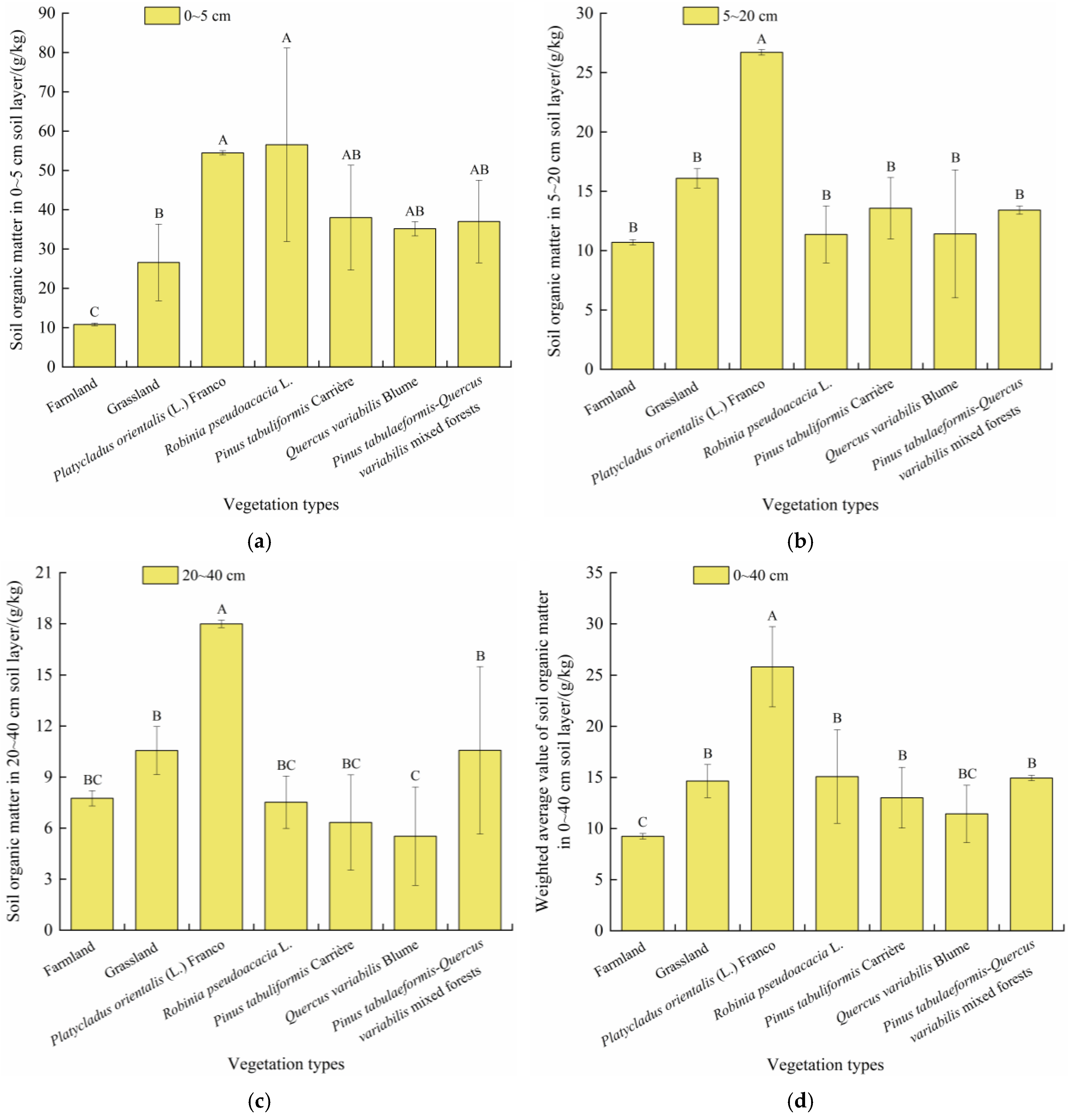 - Vegetation restoration drives substantial changes in soil properties, increasing root biomass by 70–1375% and soil organic matter by 124–279% relative to farmland. Platycladus orientalis (L.) Franco and Robinia pseudoacacia L. are particularly effective in accumulating SOM, especially in surface layers. Notably, restoration also induces textural differentiation, reducing surface clay content and altering particle-size distribution with depth, which contributes to improved soil physical structure.