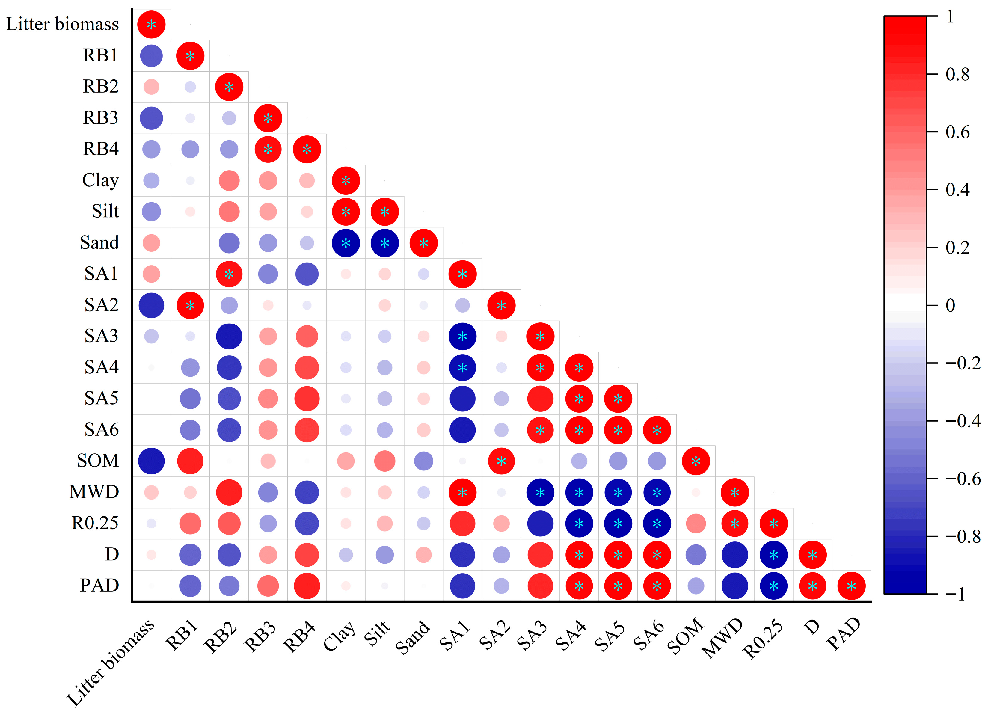 - Mechanistic analysis suggests that aggregate stability is primarily governed by coarse root biomass (RB2, RB3) and SOM, which together explain 58% of the variance in MWD. Fine roots (RB1) play a comparatively limited role, while clay and silt particles provide foundational support by facilitating organo-mineral associations. These findings elucidate that organic inputs from aboveground litter and coarse belowground tissues, and their transformation into persistent SOM, are the key drivers of soil structural improvement under vegetation restoration.