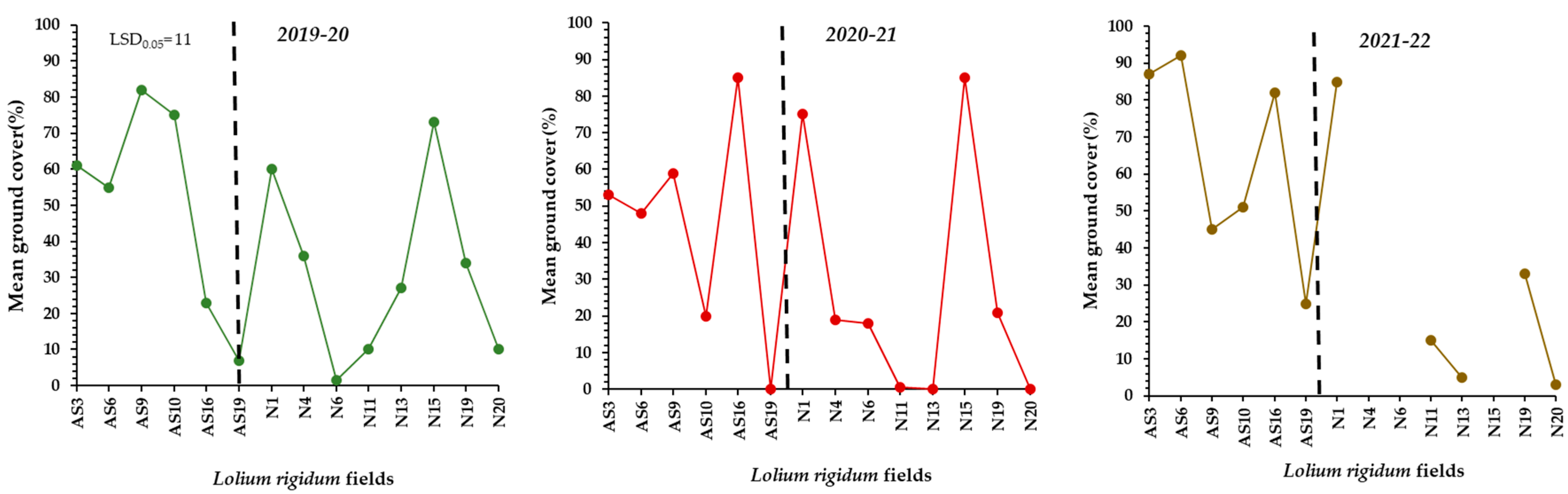 3.1. Evolution of L. rigidum’s Ground Cover and Tiller Number/Plant in the 14 Barley Fields