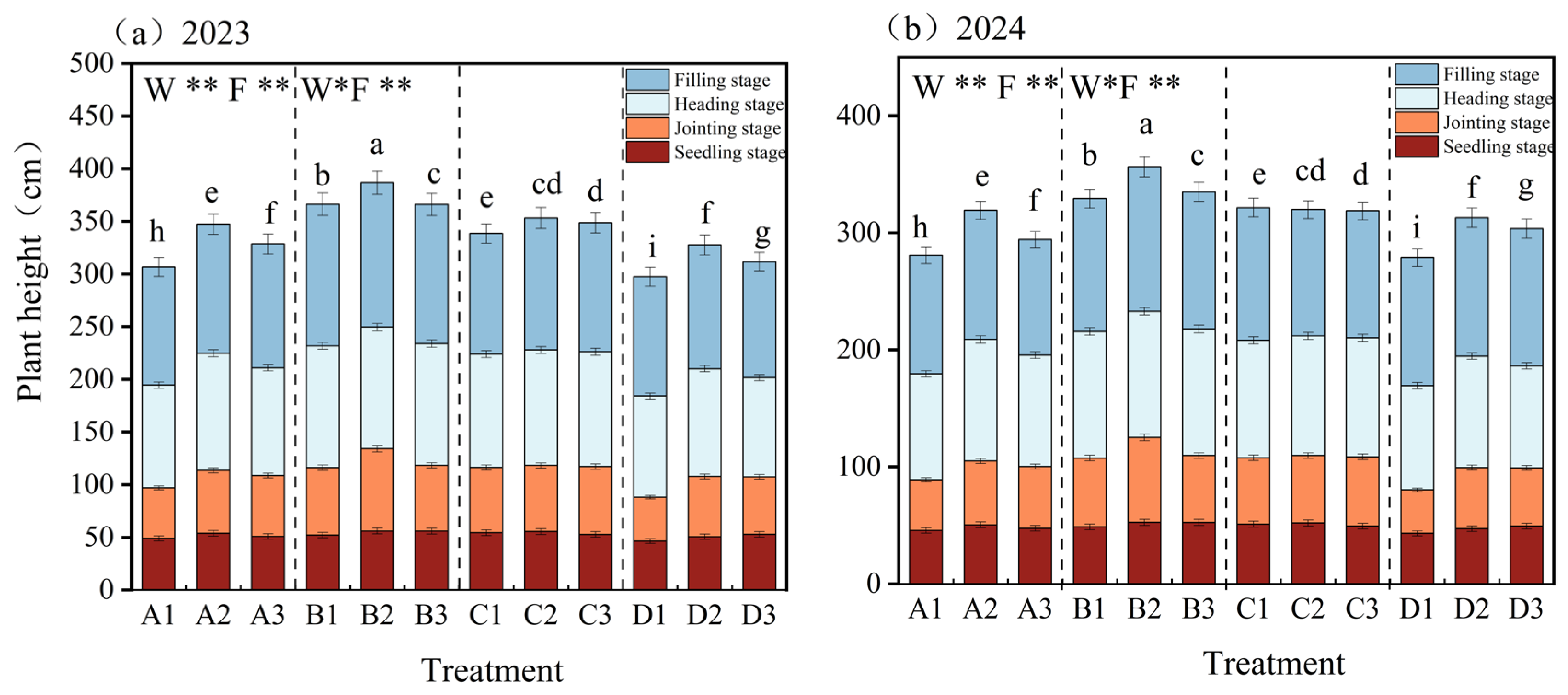 | Treatment | Plant Height Growth Rate in 2023 (cm·d−1) | Plant Height Growth Rate in 2024 (cm·d−1) |