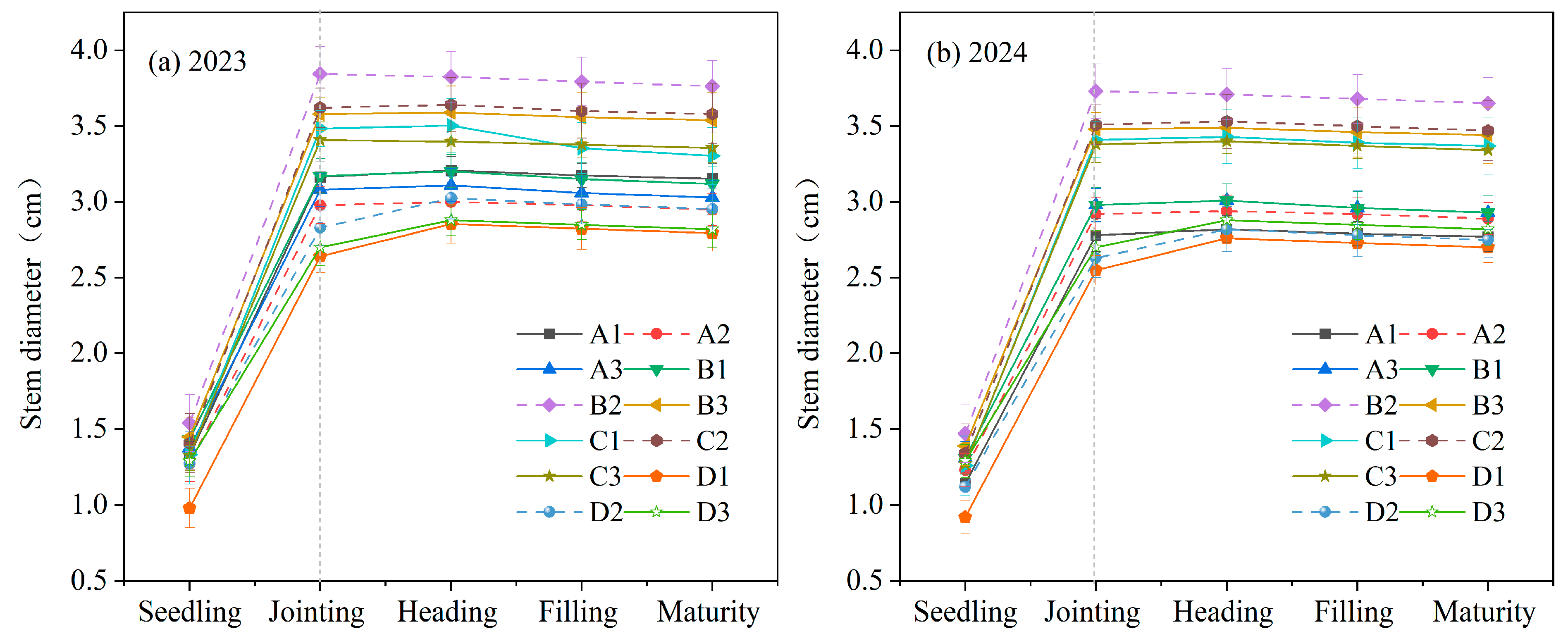 | Treatment | 2023 Stem Diameter (cm) | 2024 Stem Diameter (cm) |