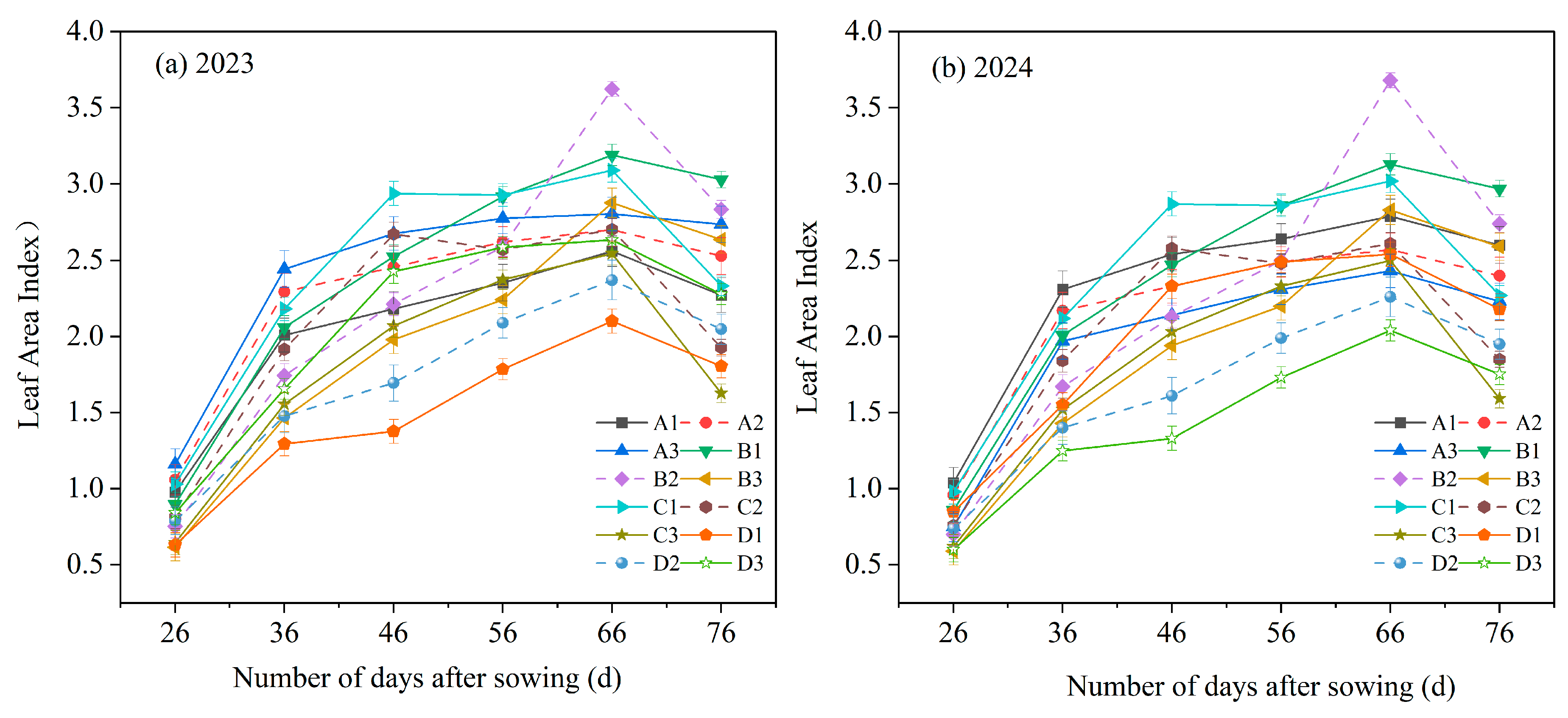 | Treatment | Leaf Area Index in 2023 | Leaf Area Index in 2024 |