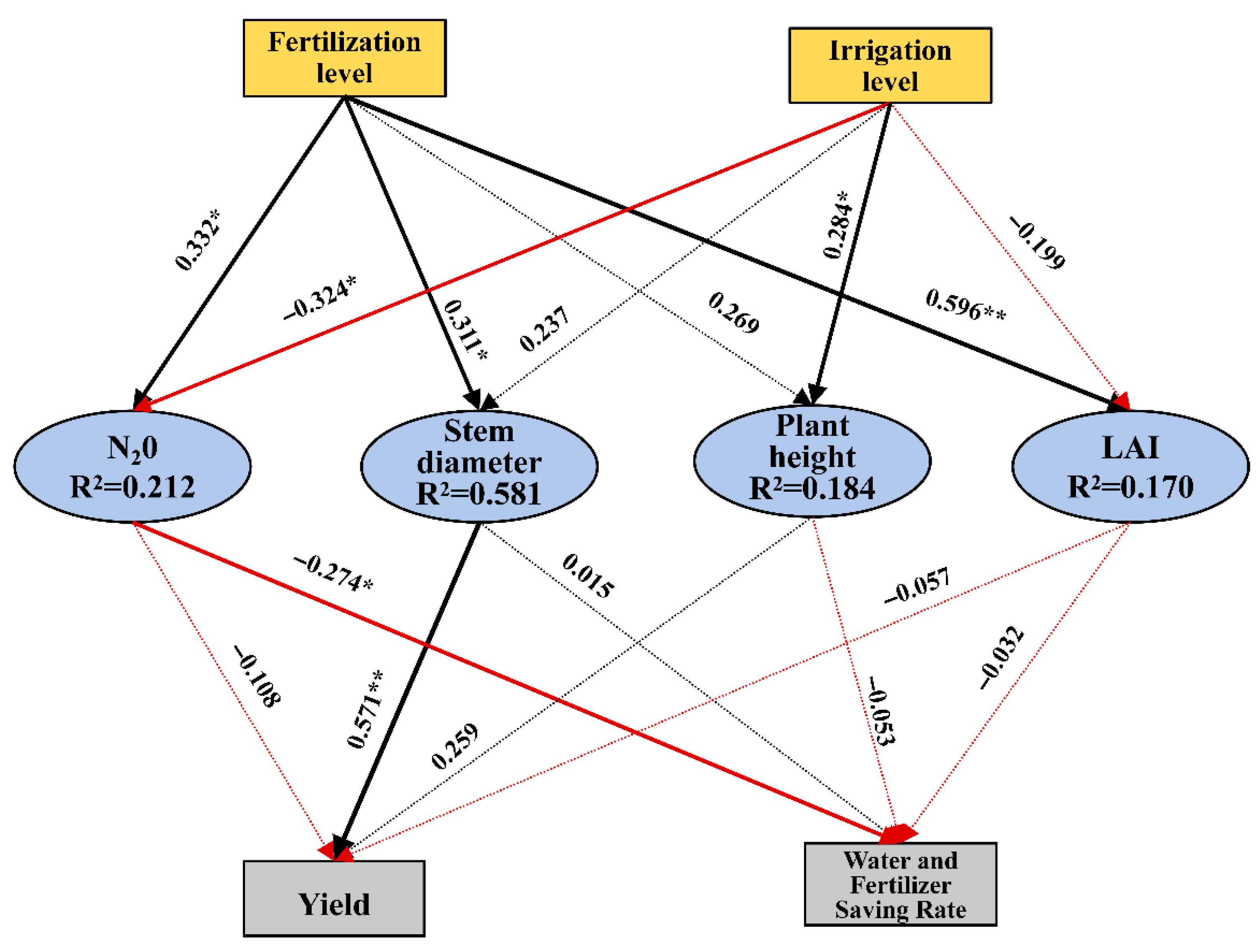 | Irrigation level → LAI | −0.199 |