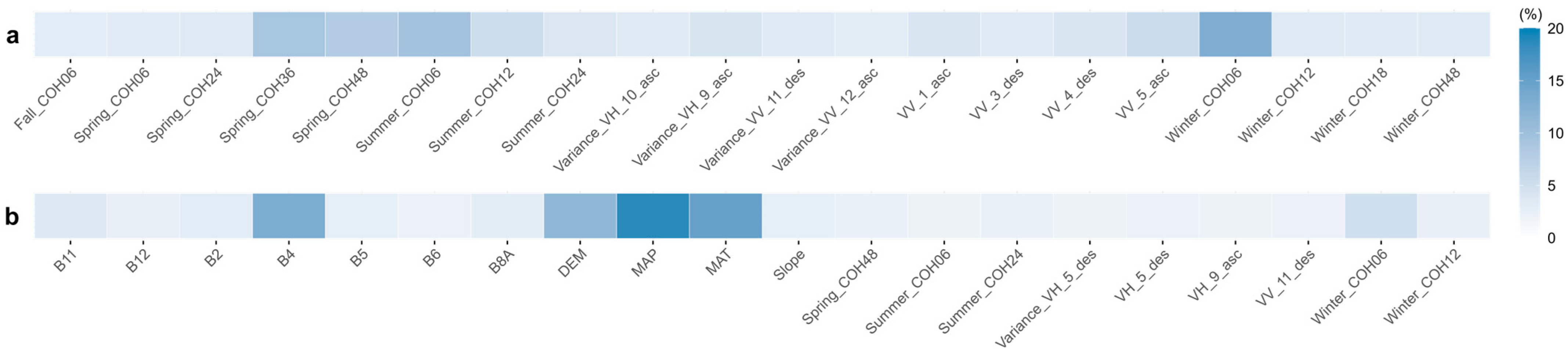 - Zhao, Q.; Xie, Q.; Peng, X.; Lai, K.; Wang, J.; Fu, H.; Zhu, J.; Song, Y. Understanding the Temporal Dynamics of Coherence and Backscattering Using Sentinel-1 Imagery for Crop-Type Mapping. IEEE J. Sel. Top. Appl. Earth Obs. Remote Sens. 2024, 17, 6875–6893. [Google Scholar] [CrossRef]
