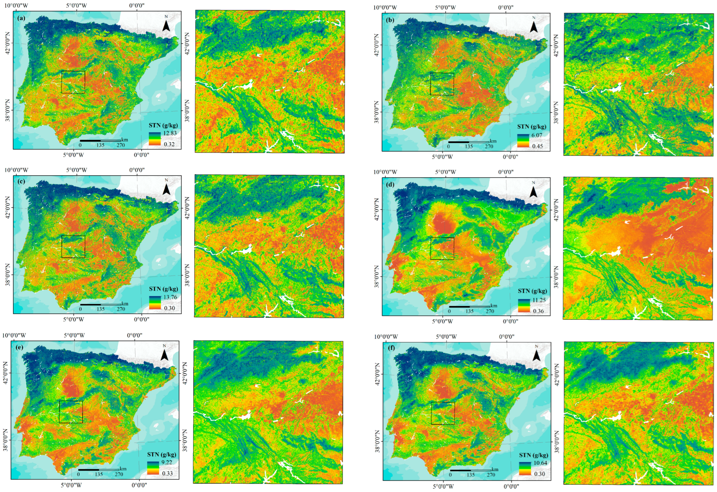 - Zhou, T.; Geng, Y.; Chen, J.; Sun, C.; Haase, D.; Lausch, A. Mapping of Soil Total Nitrogen Content in the Middle Reaches of the Heihe River Basin in China Using Multi-Source Remote Sensing-Derived Variables. Remote Sens. 2019, 11, 2934. [Google Scholar] [CrossRef]