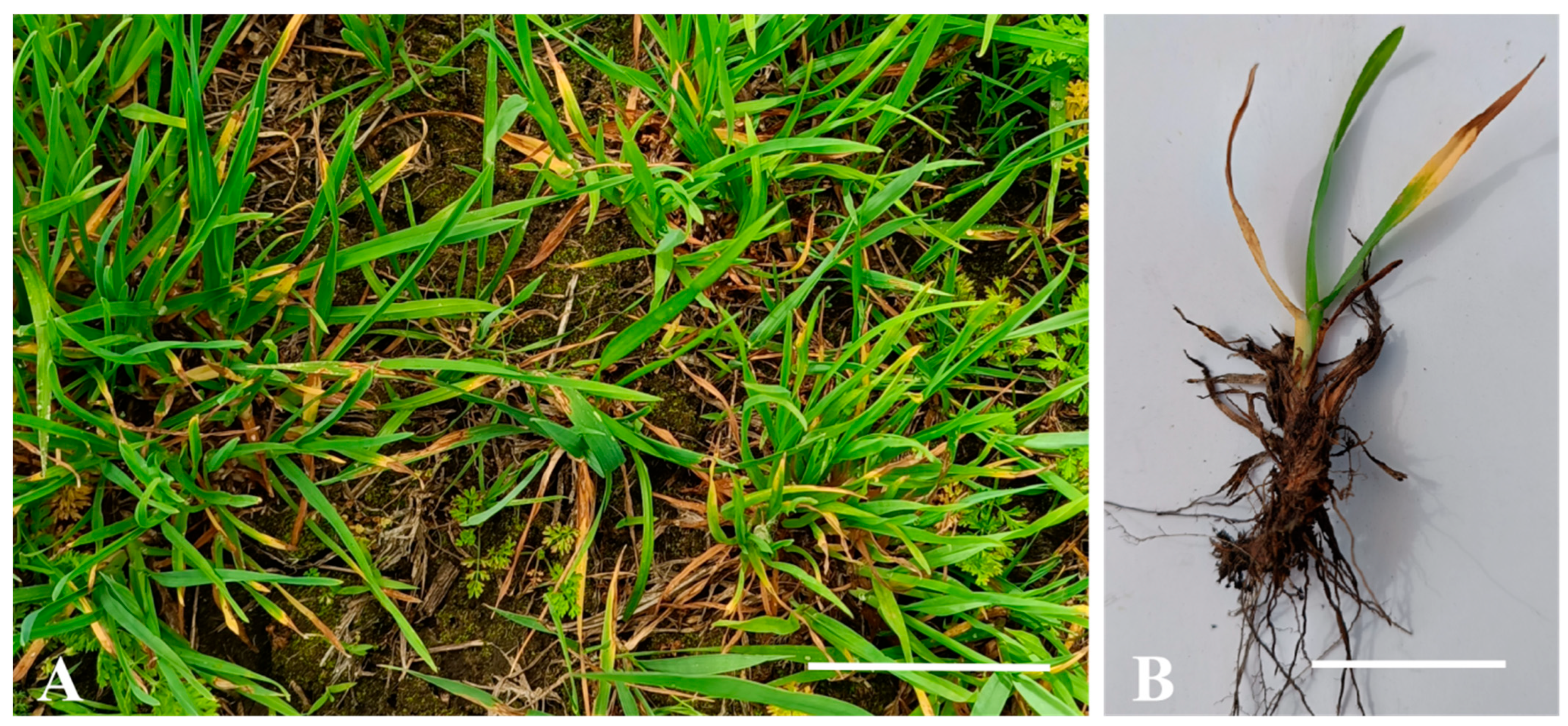 However, during orchardgrass growth, various diseases frequently occur and seriously affect forage yield and quality. Among these, rust disease is the most extensively studied [5,6], followed by smut disease [7], zonate leaf spot [8], root rot [9], and bacterial leaf streak [10]. Fulcher et al. [9] identified Fusarium graminearum as the causal agent of orchardgrass root rot from wild plants collected in Essex County, New York, USA. Root rot is highly destructive to plant health, as it damages the normal structure and function of roots, leading to water and nutrient deficiency in aerial tissues. Affected plants typically exhibit stunted growth, reduced plant height, leaf yellowing and curling, and, in severe cases, plant death. In forage crop research, root rot diseases of cultivated forages such as alfalfa, clover, and sainfoin [11,12]. Root rot can cause damage at all stages of pasture growth, leading to poor establishment, reduced yield, diminished nitrogen fixation capacity, and shortened grassland longevity and utilization period [12]. Particularly alfalfa have been extensively investigated, whereas studies on root rot of wild forage species remain limited and are mostly restricted to pathogen identification. Bipolaris sorokiniana is known to infect a wide range of plant species, including orchardgrass [13].
