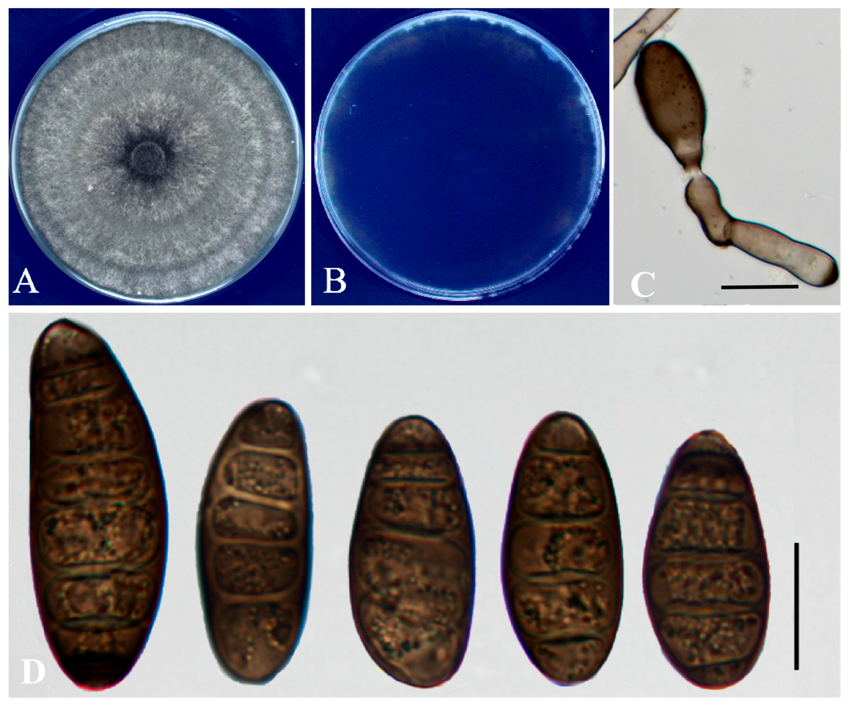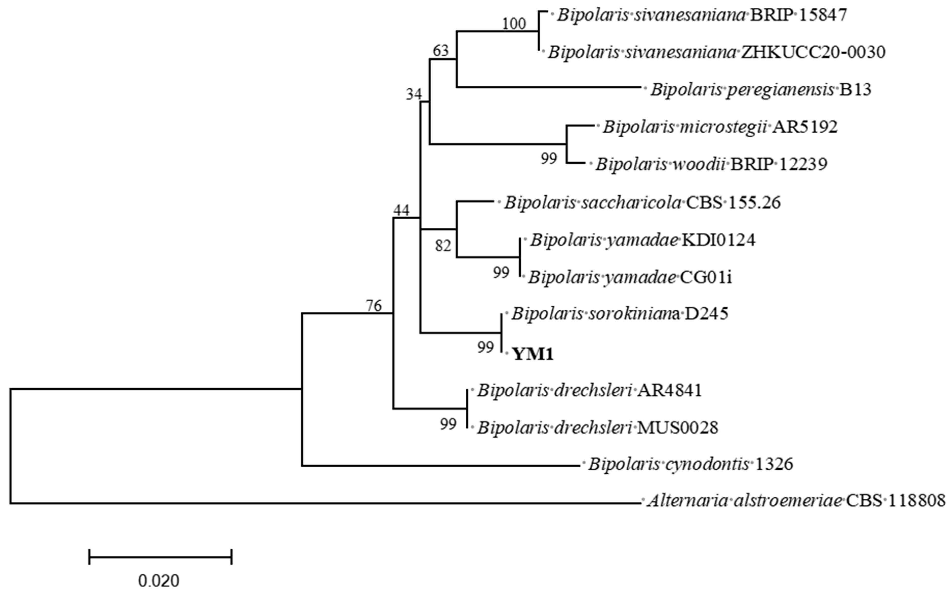PCR amplification of ITS, GAPDH and TEF from isolate YM1 produced fragments of ≈568 bp, 420 bp and 321 bp, respectively. A concatenated ITS–GAPDH–TEF maximum-likelihood tree (rooted with Alternaria alstroemeriae CBS 118808) placed YM1 in a strongly supported clade (99% bootstrap) with B. sorokiniana strain D245 (GenBank accessions: ITS PX671498, GAPDH PX879951, TEF PX879952; Figure 3). Combining morphological and multilocus molecular evidence, isolate YM1 was identified as B. sorokiniana.