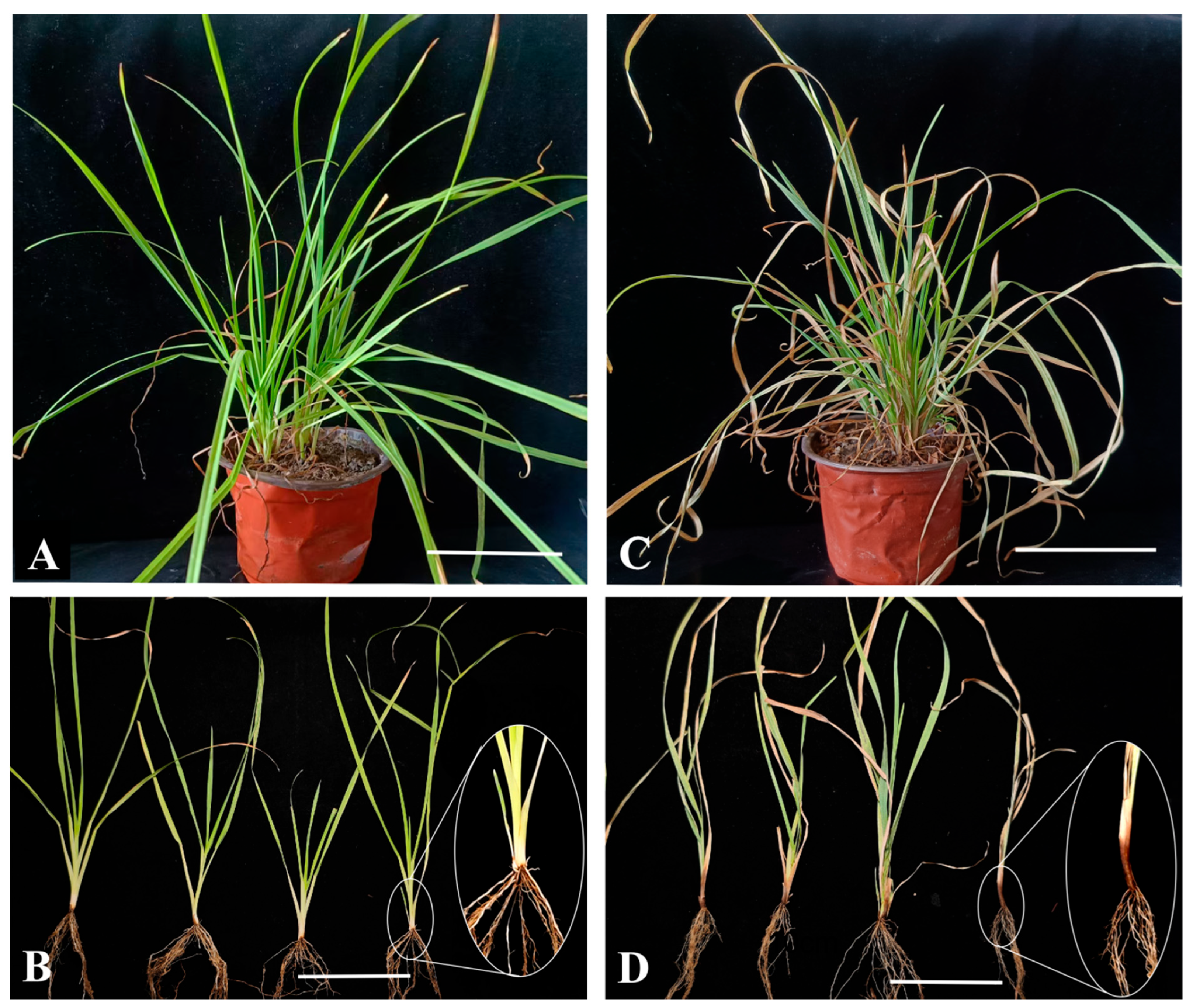 Orchardgrass plants were grown from seeds. Seeds were surface-sterilized with 75% ethanol for 30 s, rinsed three times with sterile distilled water, and sown in sterilized potting soil. Plants were maintained under greenhouse conditions at 20–25 °C for 45 days, and then used for pathogenicity assays. For inoculation, plants were immersed in a conidial suspension (1 × 106 spores·mL−1) for 15 min. After transplanting, 15 mL of the same suspension was applied as a soil drench to each pot. Control plants were treated with sterile water using the same immersion and drench methods. Each treatment consisted of three replicate pots, with five plants per pot. Disease development was assessed 15 days post-inoculation. To fulfill Koch’s postulates [11], re-isolation was performed from symptomatic roots, and the morphological characteristics of the re-isolated strains were compared with those of the original inoculum.