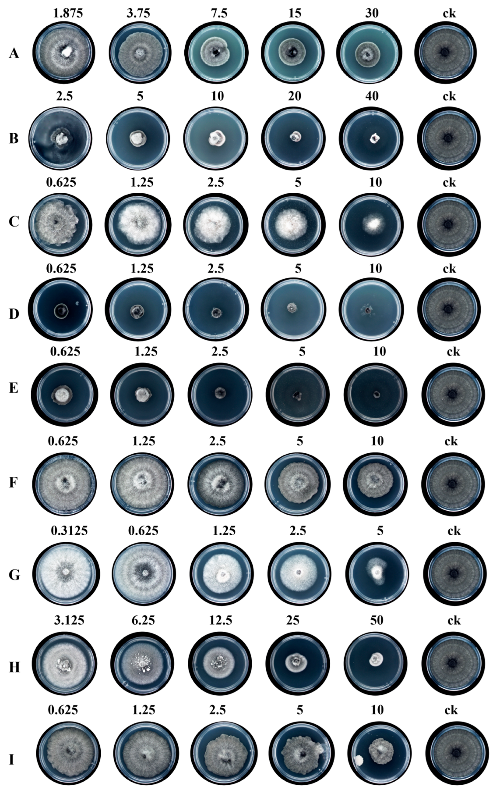 The inhibitory activity of fungicides against the pathogen was evaluated using the mycelial growth rate method [22]. Under aseptic conditions, stock solutions of the tested fungicides were diluted to seven concentration gradients for preliminary experiments to determine the optimal concentration range. Based on the preliminary results, five concentration gradients were established for each fungicide and incorporated into PDA to prepare amended media (Table 2). PDA without fungicides served as the control. A 5 mm-diameter mycelial plug taken from the actively growing margin of the colony was placed at the center of each plate. Each treatment consisted of three replicate plates, and the experiment was conducted once. Plates were incubated at 25 °C for 5 days, after which colony diameters were measured using the crossed-line method. The percentage inhibition of mycelial growth was calculated relative to the control. The inhibition rate for each fungicide concentration was determined. Using the logarithmic concentration (Log10) as the independent variable and the probit value of the inhibition rate as the dependent variable, a toxicity regression line was fitted via Probit analysis using SPSS (version 25.0). The effective concentration for 50% inhibition (EC50) and its 95% confidence interval were calculated. The coefficient of determination (R2) was used to evaluate the goodness-of-fit of the regression model.