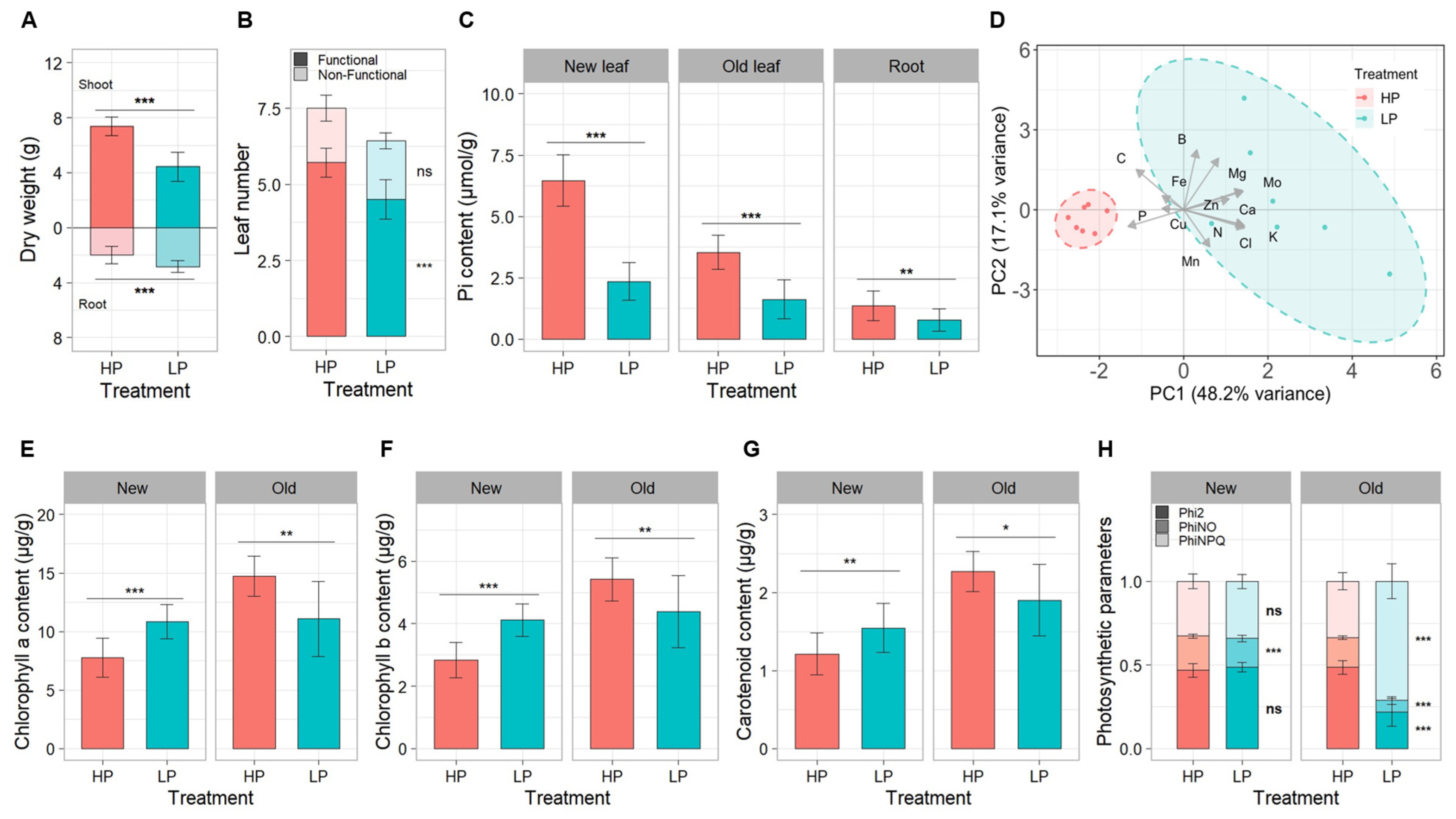 2.1.1. Experiment 1: Long-Term Phosphorus Deficiency in Pot System