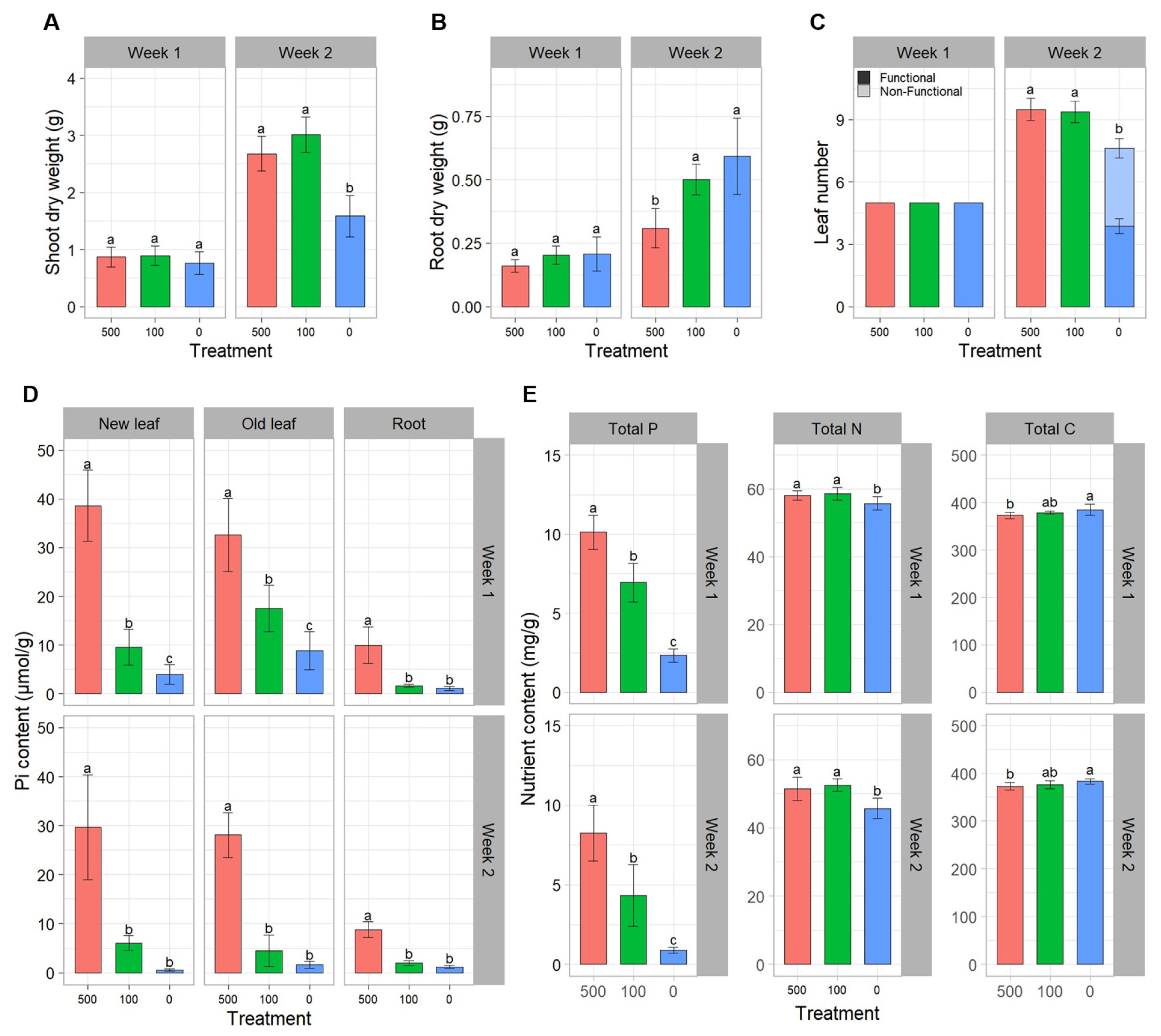 2.1.2. Experiment 2: Short-Term Phosphorus Deficiency in Hydroponic System