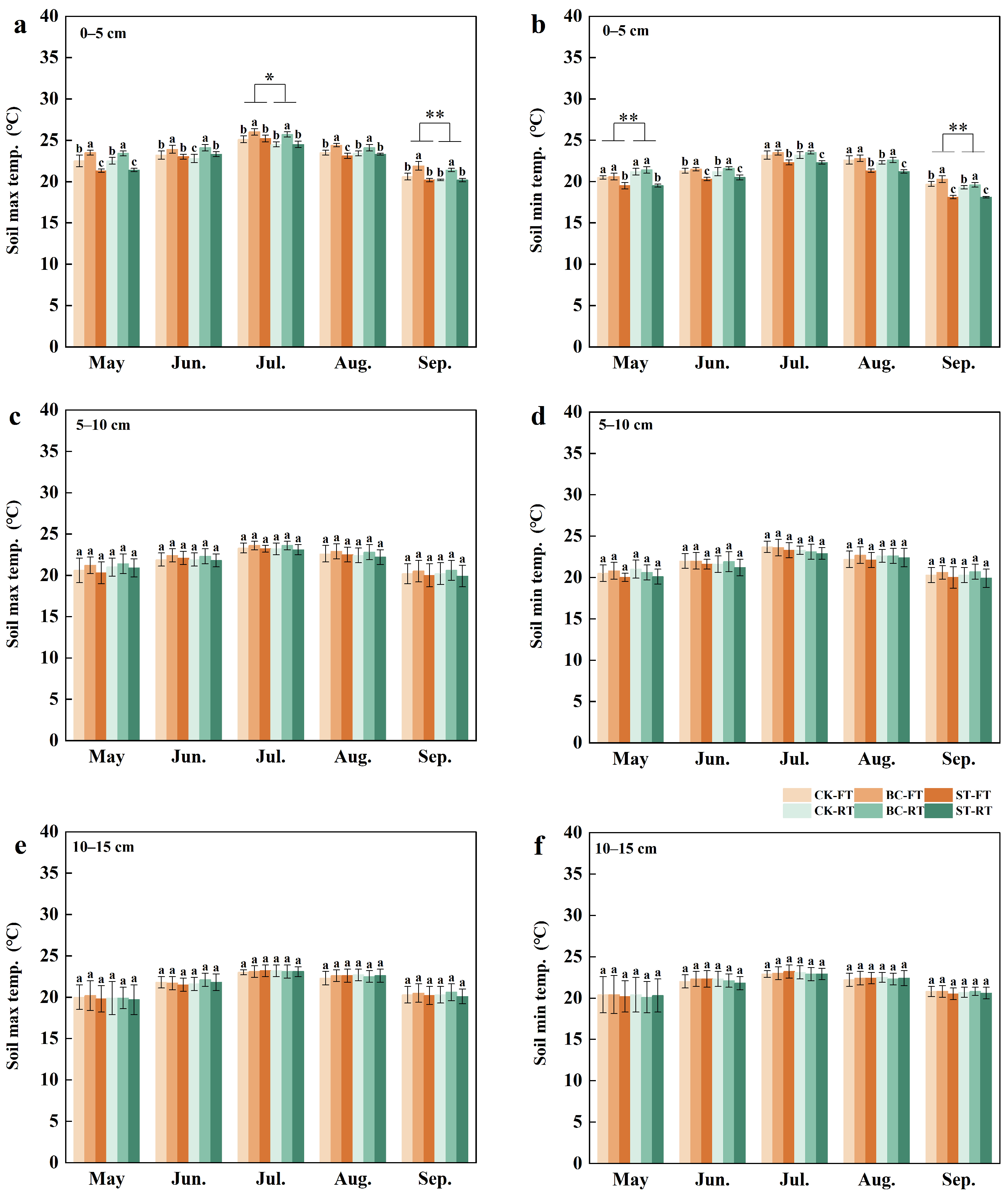 4.2. Effects of Straw and Biochar Application on Soil Temperature